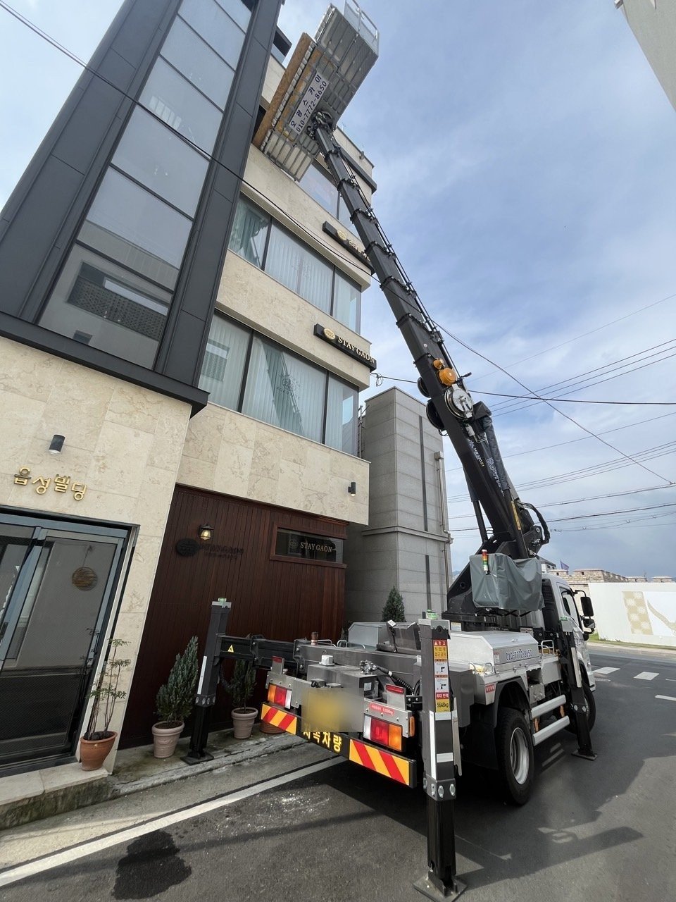 울산 스카이 장비 외벽 실리콘 시공·폐자재 양중 현장 후기 3.5톤 안전 작업
