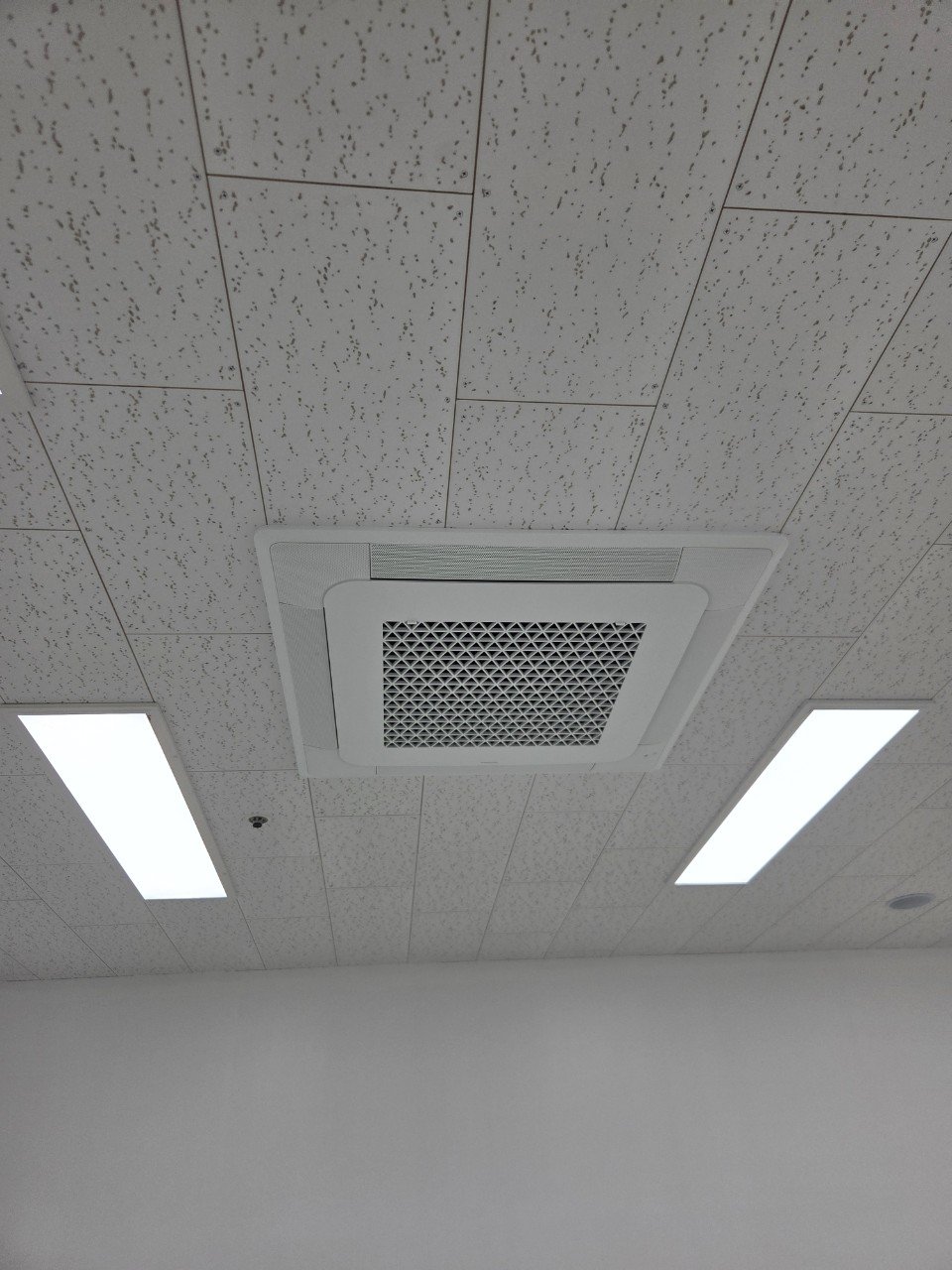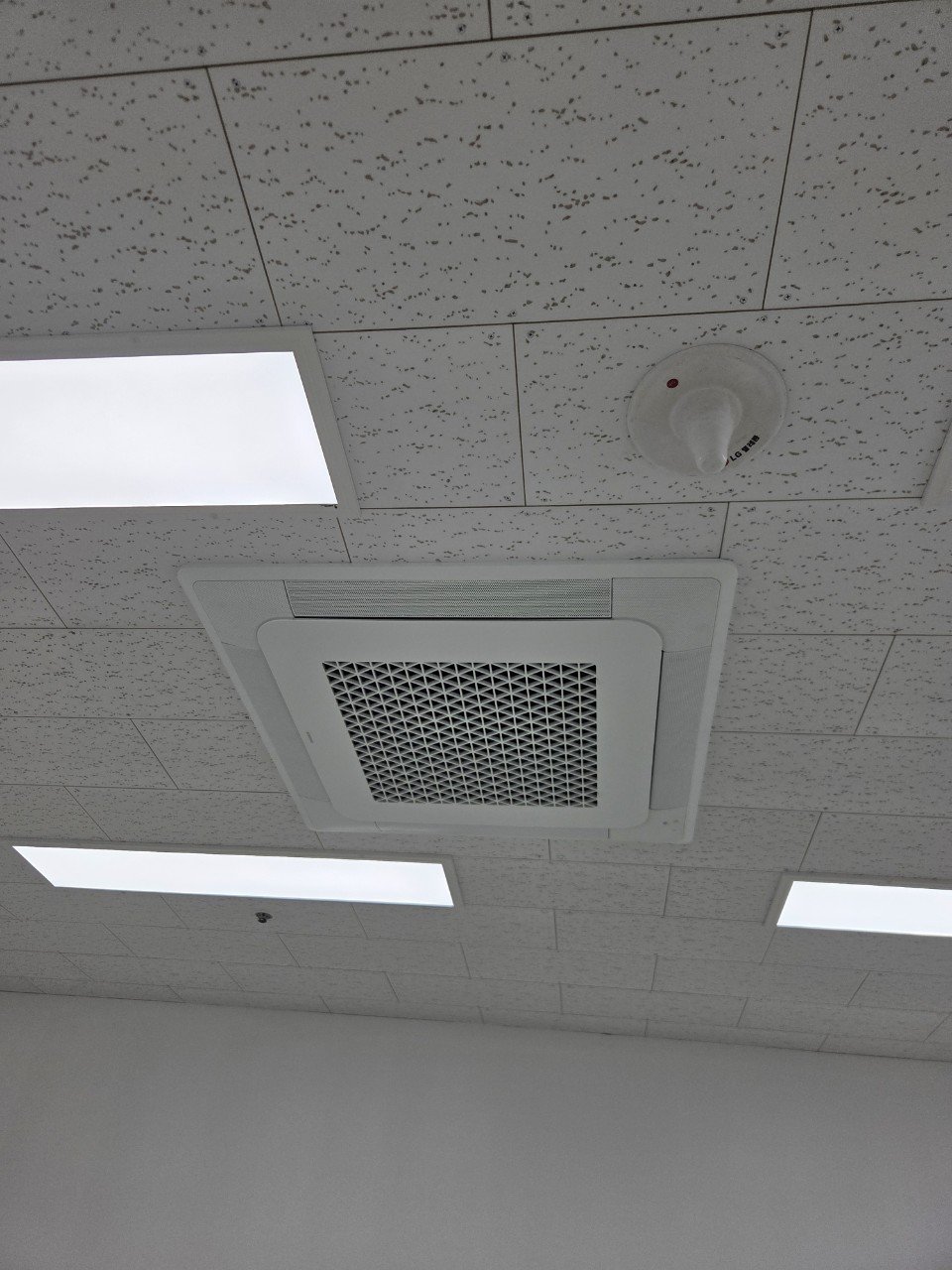 천장 마감 상태도 처음보다 한결 정돈되어 보이고, 실내기와 그릴의 위치가 공간 구조와 잘 어울리도록 자리 잡으면서 연구실로 전환되는 분위기가 자연스럽게 완성되었습니다.