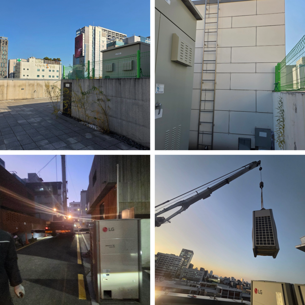 이 건물 옥상은 접근성이 좋지 않아 처음 현장 답사 때부터 장비 동선과 안전 계획을 세심하게 살펴봐야 했습니다. 특히 10마력급 멀티V 실외기는 무게가 상당해 인력만으로는 옥상까지 올리기 어렵기 때문에, 크레인을 이용한 새벽 시간대 작업으로 계획을 잡았습니다.