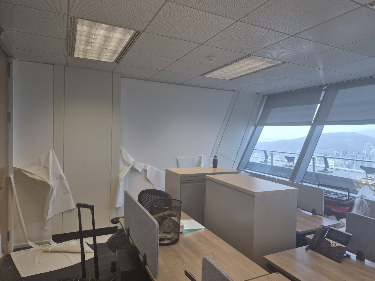 이 현장은 구조도 조금 까다로운 편이었습니다. 정직한 사각형 공간이 아니라, 큰 유리창이 사선으로 길게 이어져 있었고, 그 안쪽으로 책상, 전화기, 수납장, 유리 파티션이 함께 배치된 공유오피스 구조였습니다.