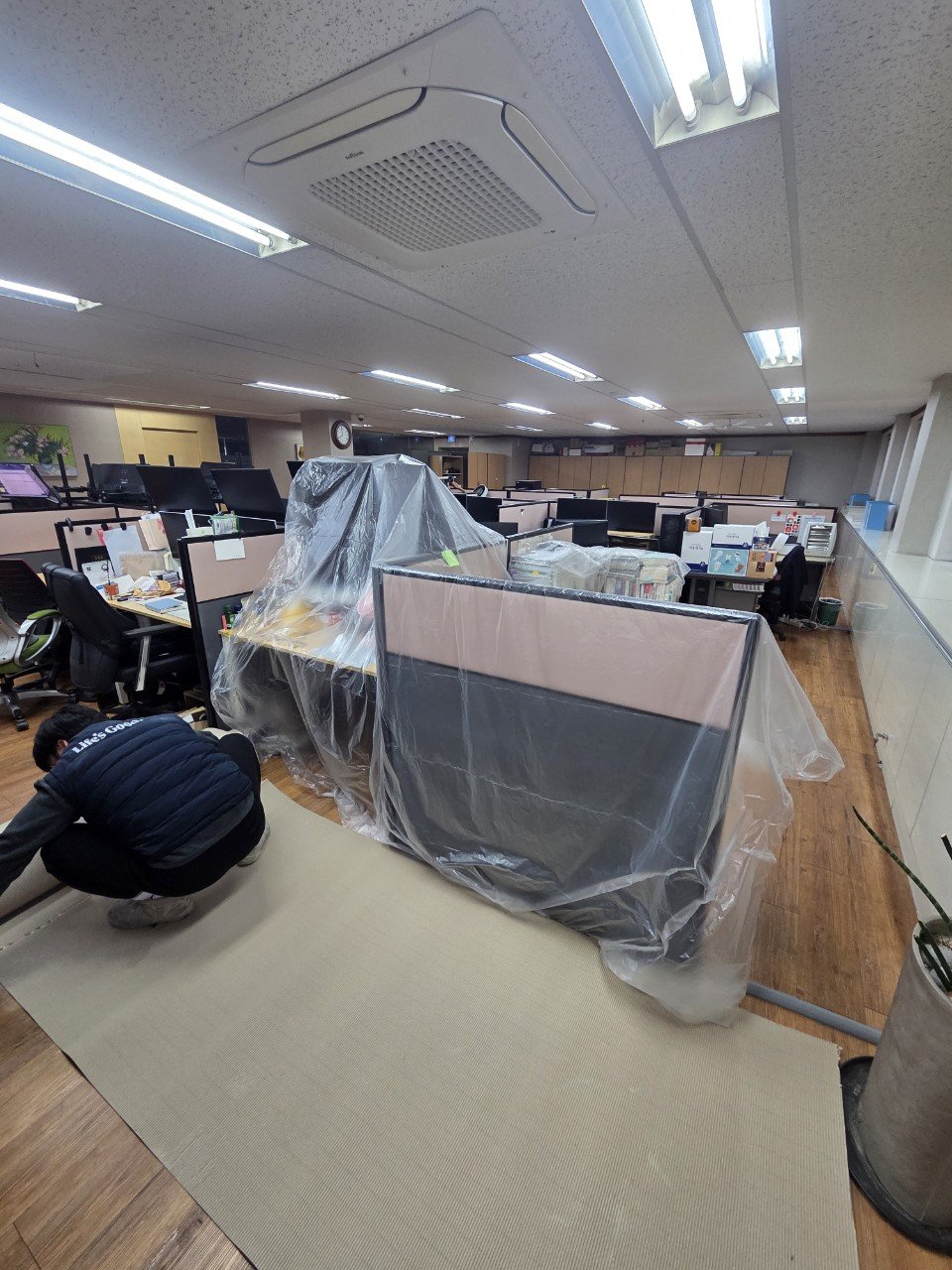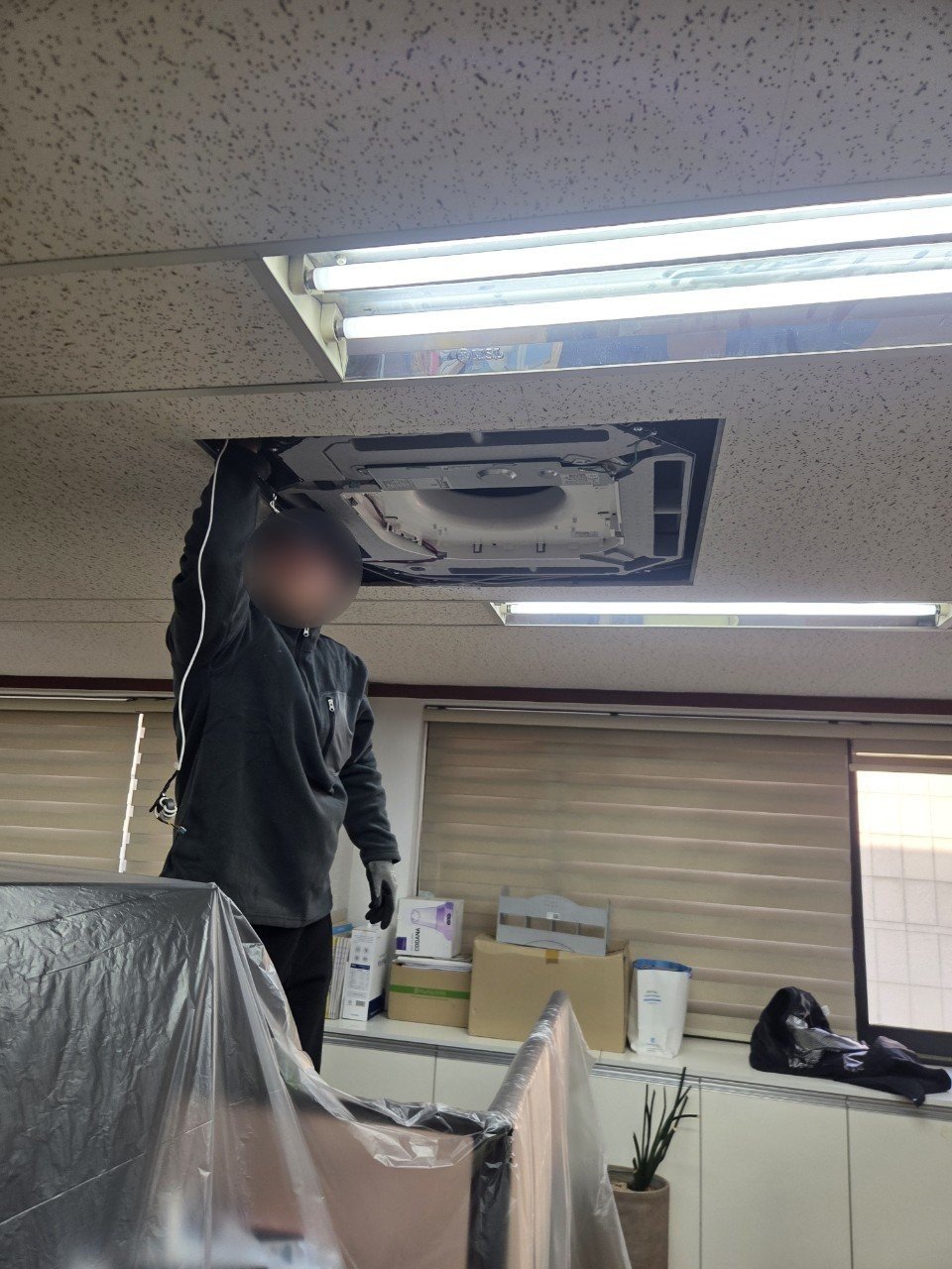 천장형 실내기를 교체할 때는 천장 재나 마감재가 손상되지 않도록 보호하고, 실내 먼지 발생을 최소화하는 것이 중요합니다. 다만, 이번 현장은 동선이 깔끔하고 주변 집기가 많지 않아 보양을 과도하게 할 필요는 없었고, 안전과 청결을 지키는 선에서 효율적으로 작업했습니다.