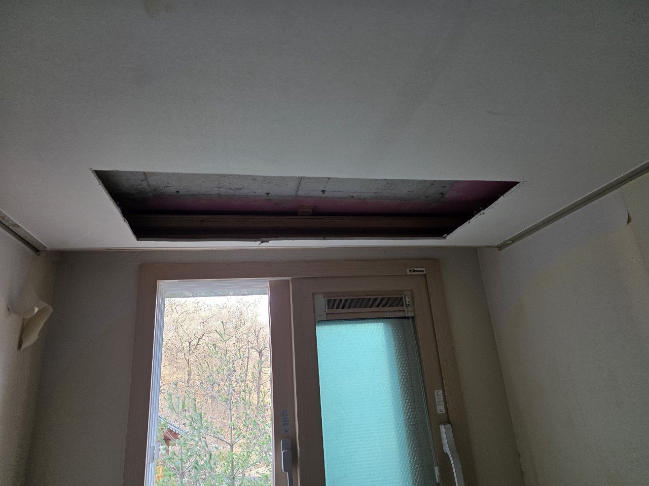 위치가 확정된 후에는 거실과 각 방에 들어갈 실내기에서 실외기가 놓일 베란다까지의 배관 작업을 진행했습니다.