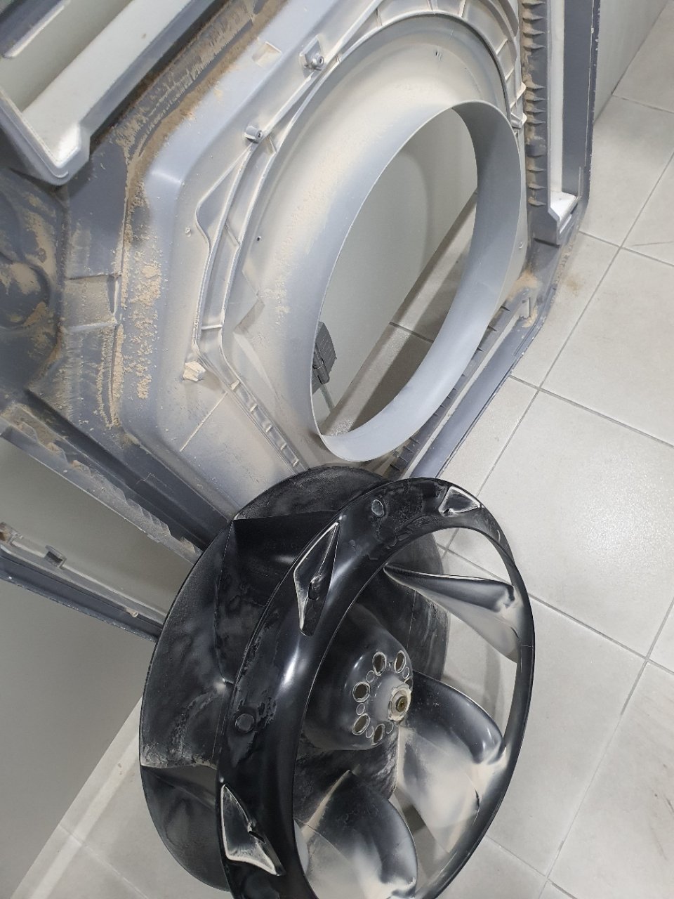 그다음 외장 패널부터 내부 부품까지 순서대로 분리하며 전체 상태를 확인했습니다. 팬, 열교환기, 드레인 팬과 트레이, 필터와 패널 안쪽까지 하나씩 열어보면서 분진이 많이 쌓인 구역을 중점적으로 체크했습니다.