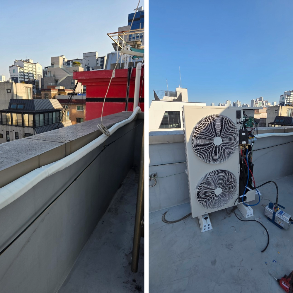 실외기는 옥상에 설치했습니다. 바닥 진동을 줄이기 위해 받침대를 보강하고 수평을 재확인했어요. 노출되는 배관 라인과 전선은 정리 후 덕트로 깔끔하게 마감했습니다. 외관도 중요하지만, 유지보수 접근성까지 고려해 라벨링과 동선 구분도 함께 했습니다.