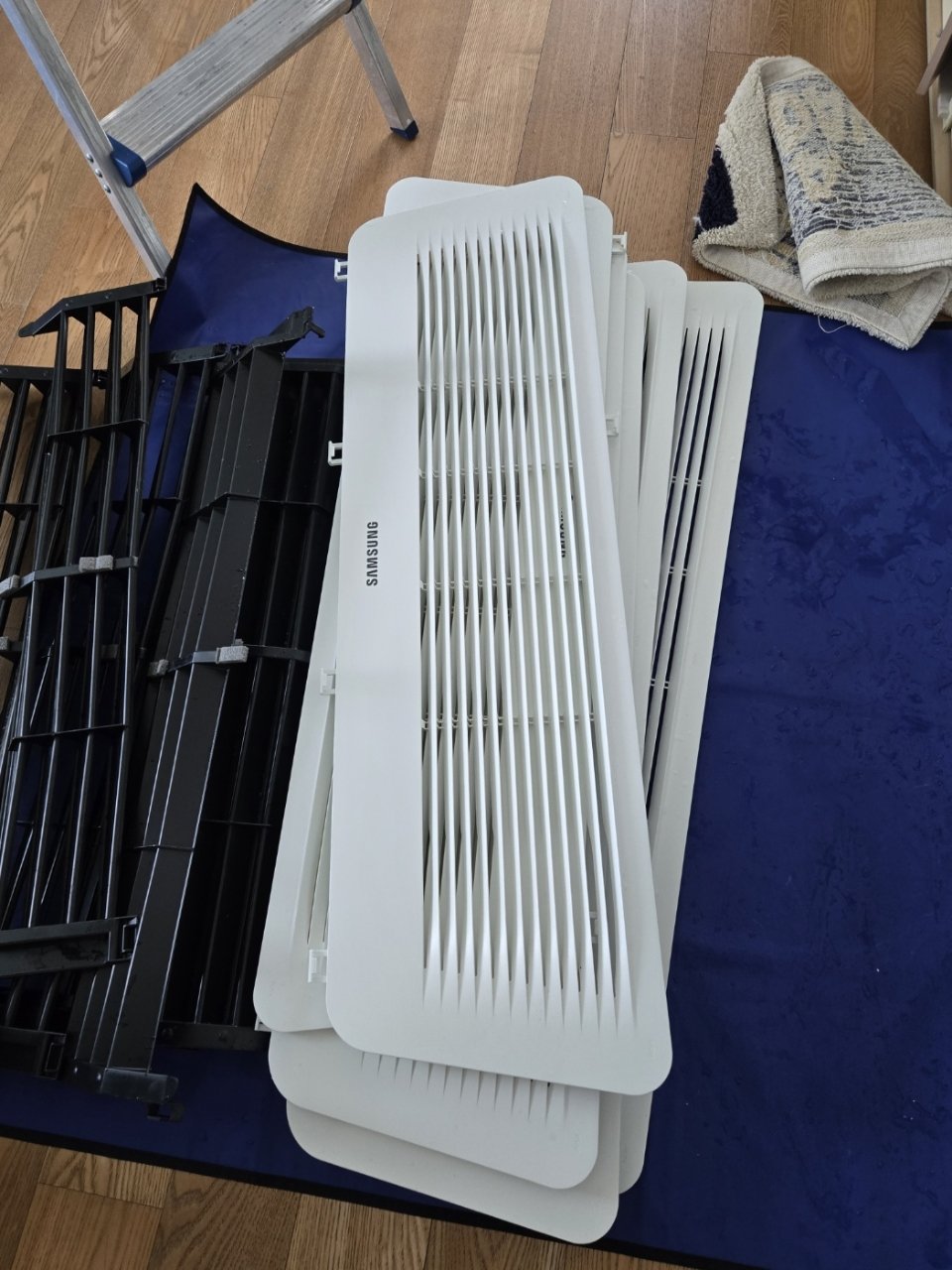 본격적인 작업은 패널과 필터, 루버, 외장 커버 순서로 분리하면서 시작했습니다. 각 부품을 분리할 때는 실내기로 물이 흘러 들어가지 않도록 보호하고, 전기 부품 주변은 안전을 위해 따로 커버링 작업을 진행합니다.