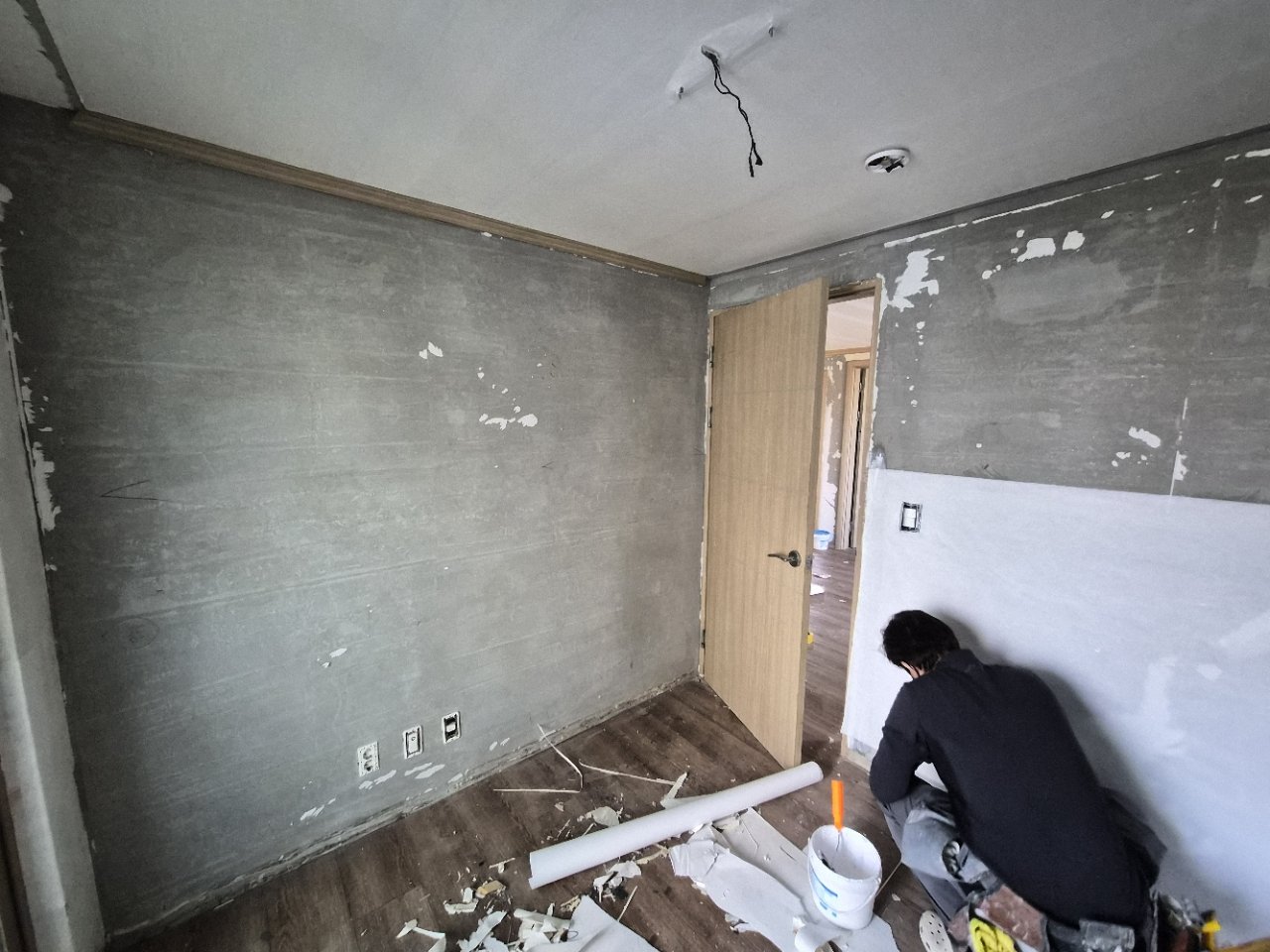 단열공사 이후에는 폼을 고르게 도포해 단열재를 부착하고, 그 위에 초배를 통해 다시 한 번 면을 정리하는 과정을 거칩니다. 이 초배 작업이 제대로 되어 있어야, 그 다음으로 들어가는 실크벽지가 안정적으로 자리 잡게 됩니다.
