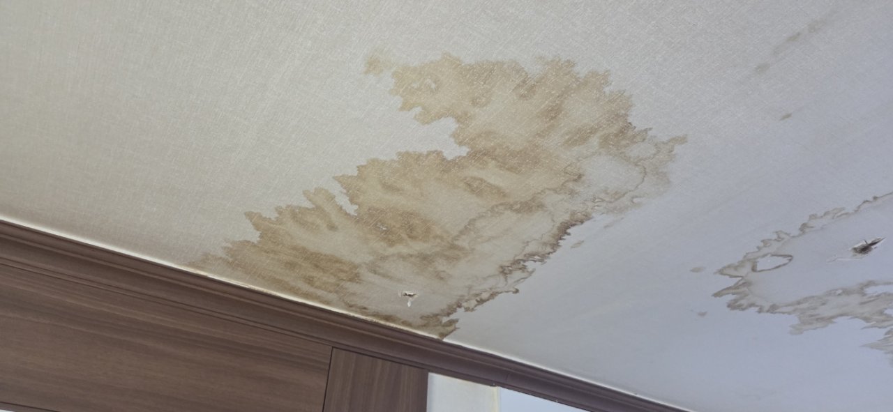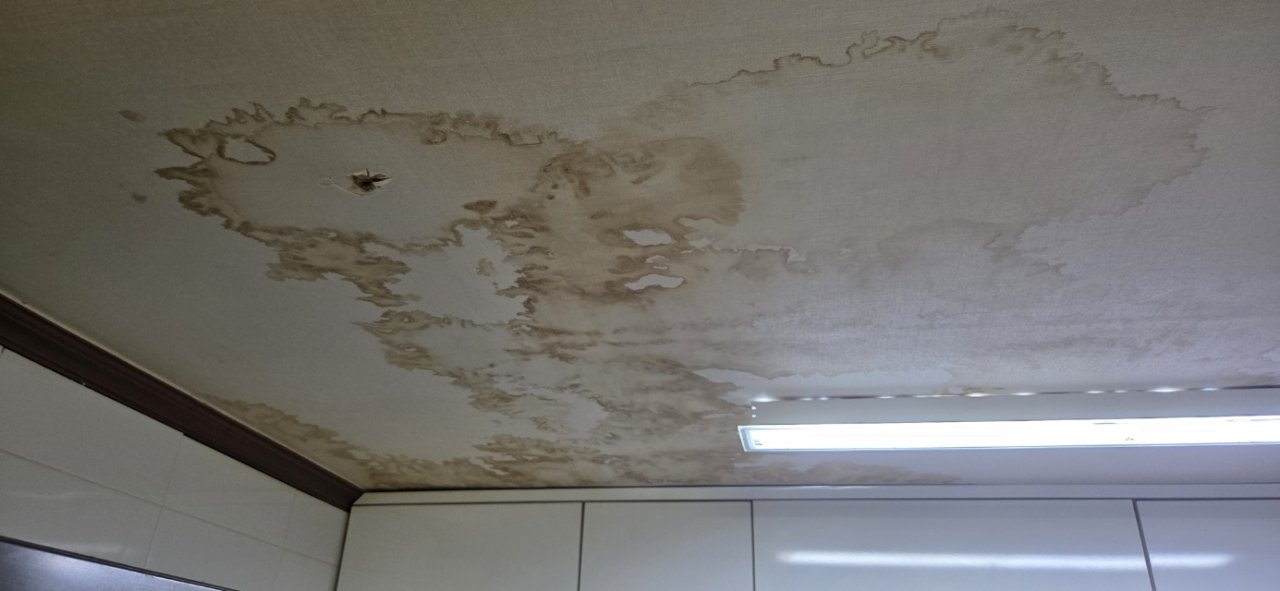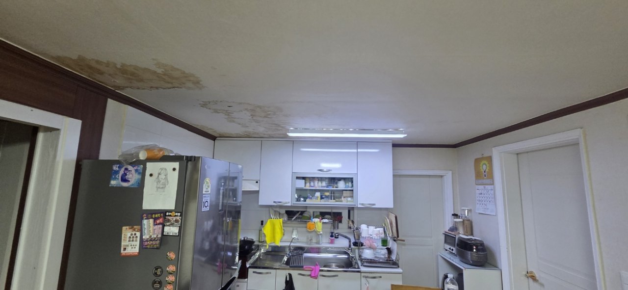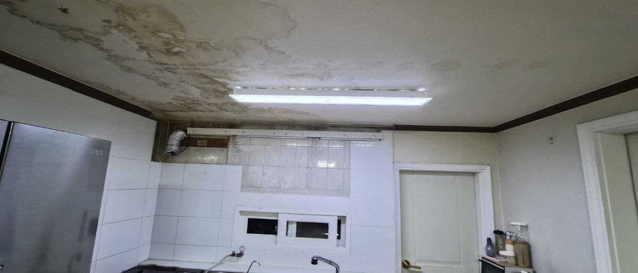 현장에 도착했을 때 가장 먼저 눈에 들어온 건 주방 천장에 남아 있는 넓은 누수 흔적이었습니다.