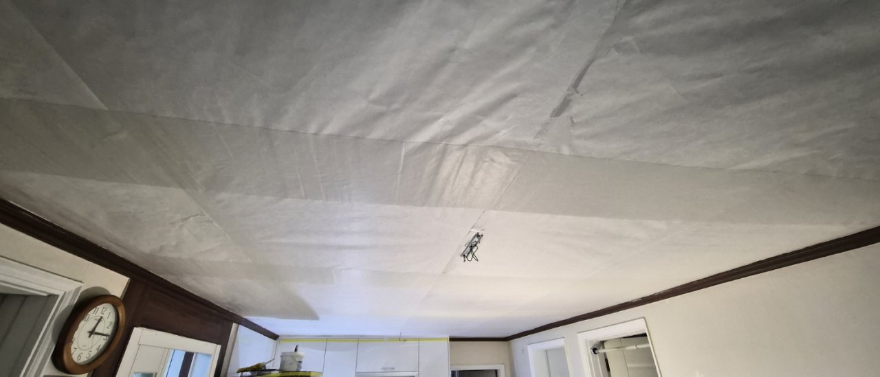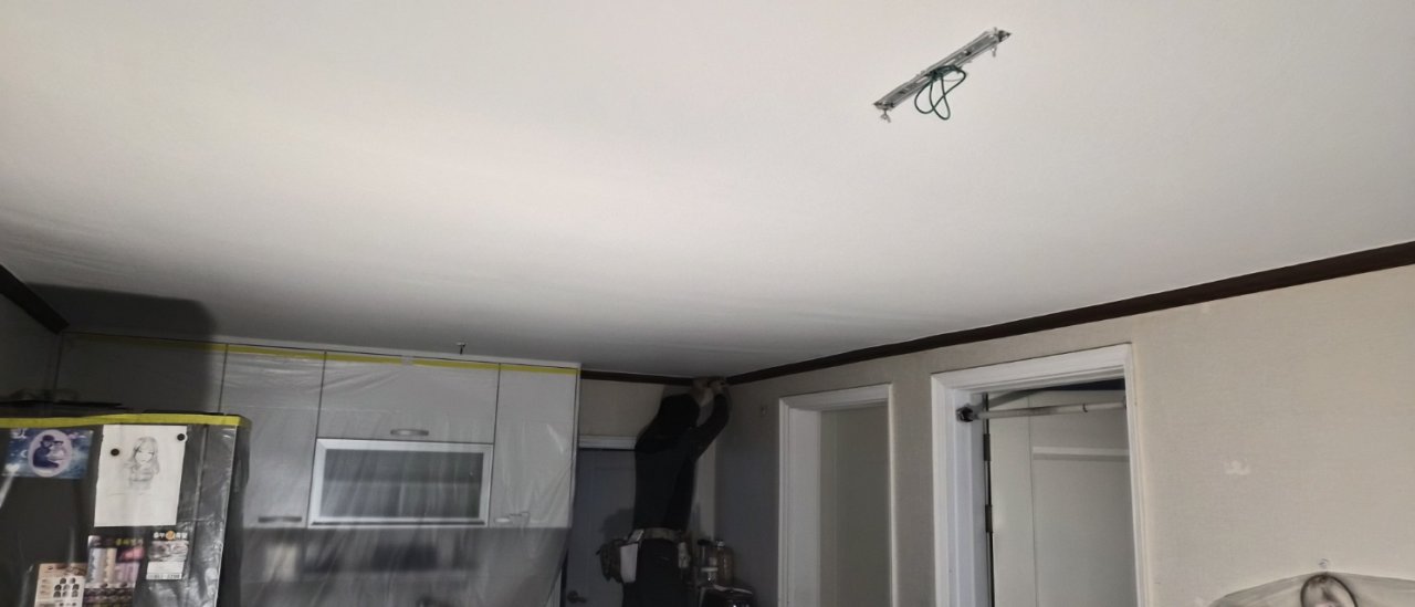 그래서 이번 현장에서는 천장에 텍스로 초배를 먼저 잡아드렸습니다. 초배 작업은 말 그대로 바탕을 한 번 더 안정적으로 만들어주는 과정입니다.