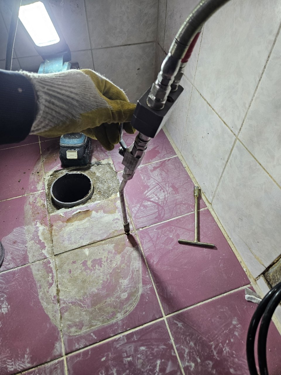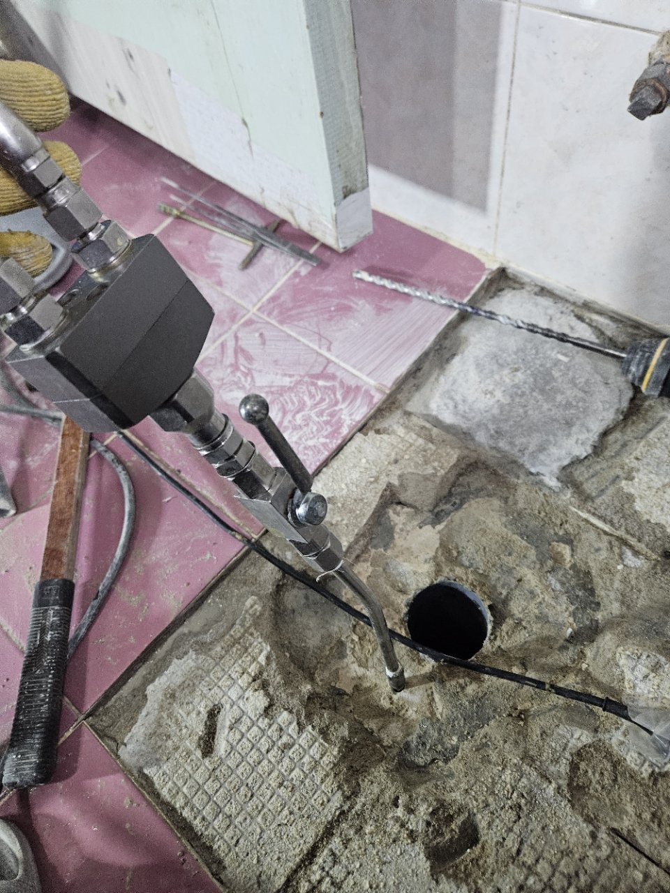 시공은 화장실 바닥 전체를 막연히 건드리는 방식이 아니라, 누수와 연결된 의심 구간을 먼저 정확히 잡는 것부터 시작합니다. 배수구 주변, 슬라브 내부 틈, 아래층으로 이어지는 물길을 중심으로 주입 포인트를 설정하고, 재료가 내부까지 충분히 퍼질 수 있도록 순서대로 작업을 진행했습니다.