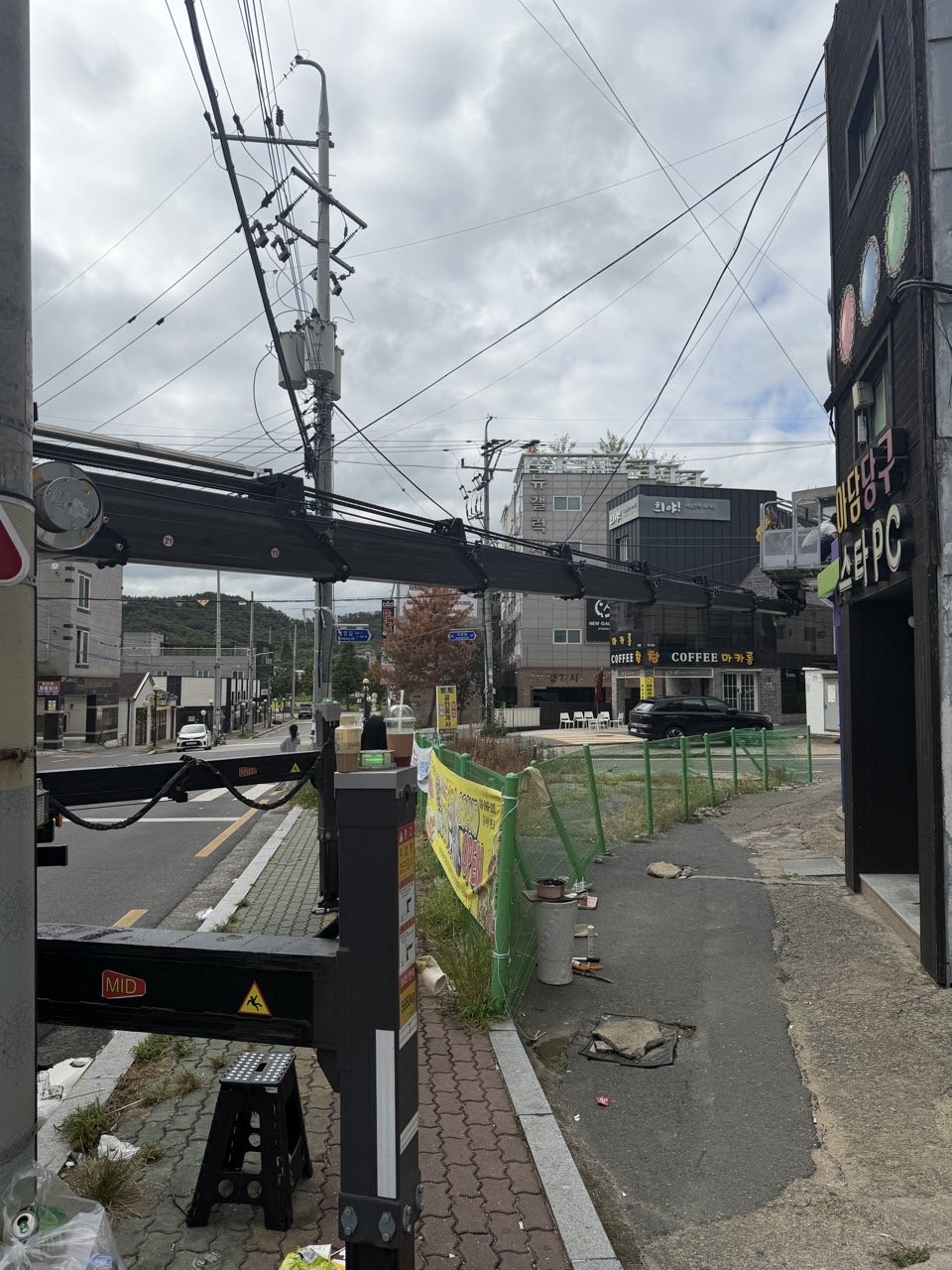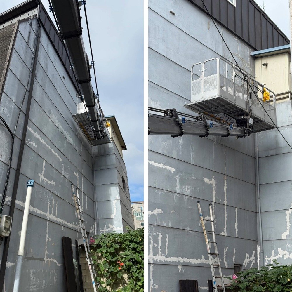 도로와 가까운 외벽은 통행 안전 확보가 우선입니다. 작업 전 안전표지와 콘을 충분히 배치하고, 차량 지지대(아웃리거)를 단단히 펼친 뒤 지면 수평을 맞췄습니다. 이후 붐을 길게 뻗어 작업 높이·거리·각도를 미리 체크해, 작업 중 불필요한 재배치를 줄였어요.