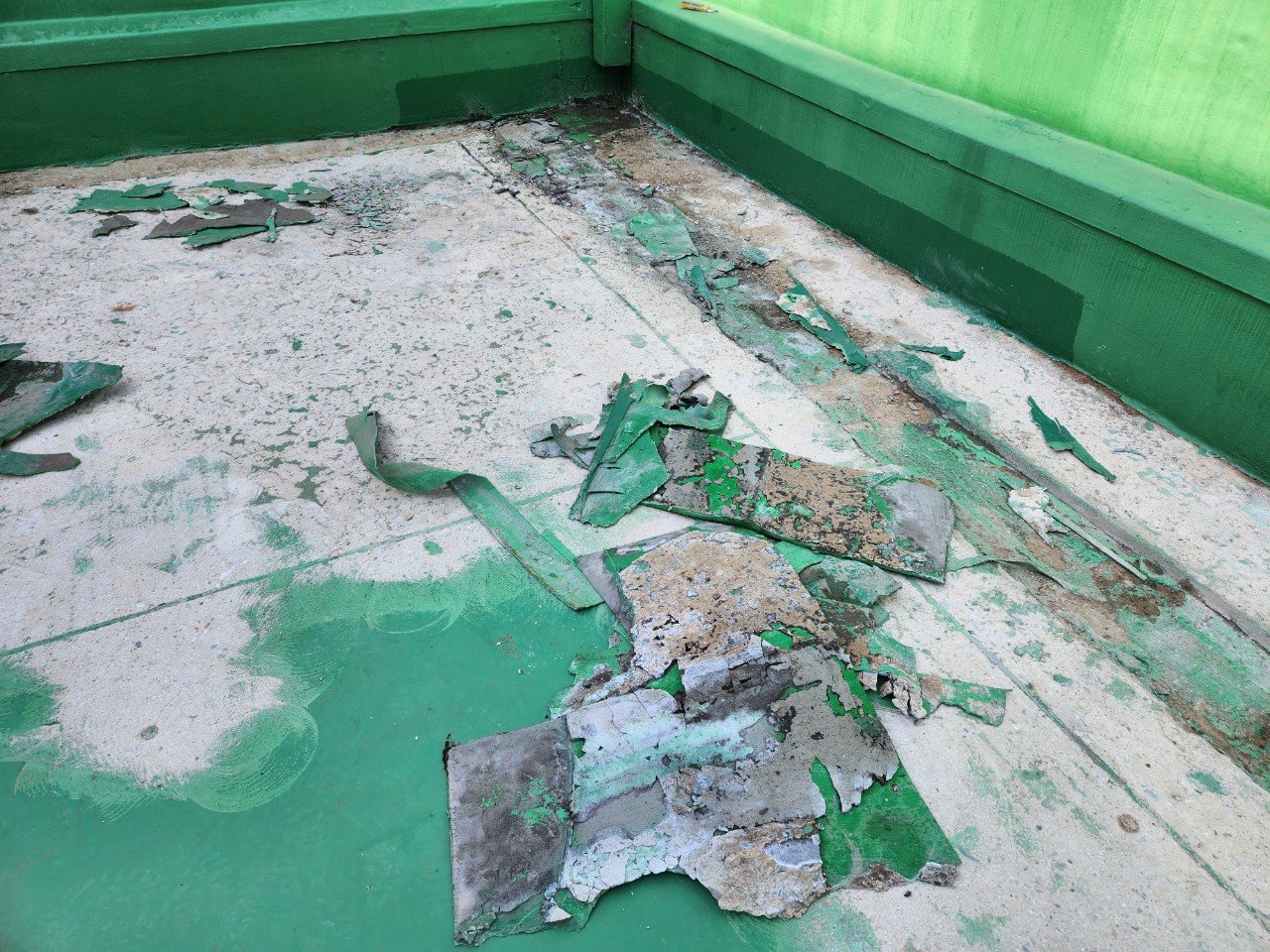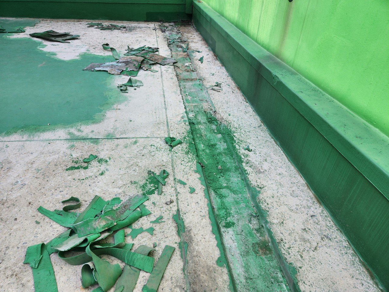 옥상 바닥에는 오래전에 시공된 녹색 방수층이 남아 있었는데, 군데군데 들떠 있거나 벗겨진 부분이 눈에 띄었습니다. 특히 벽체와 바닥이 만나는 모서리 라인, 이음부 주변은 시간이 지나며 손상이 진행된 상태였고, 그대로 두기에는 누수 위험이 커 보였습니다.