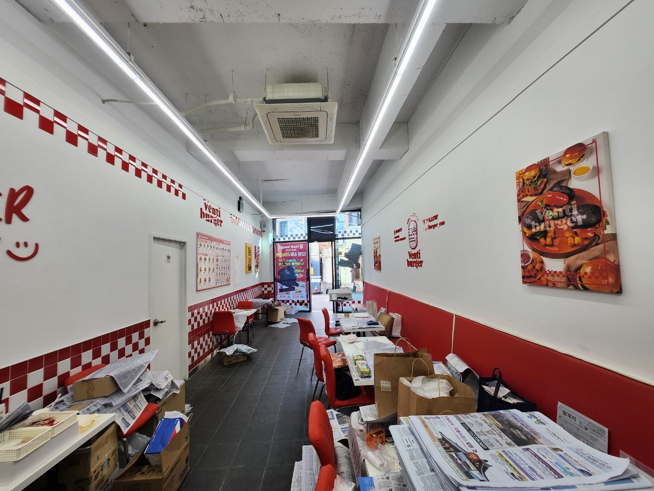 홀 공간은 수제버거 브랜드 특유의 붉은색 포인트 인테리어가 눈에 띄었습니다. 벽면 장식과 메뉴판, 각종 소품들이 매장 분위기를 살려 주고 있었는데요, 이번 철거에서는 이 부분도 전부 정리 대상이었습니다.