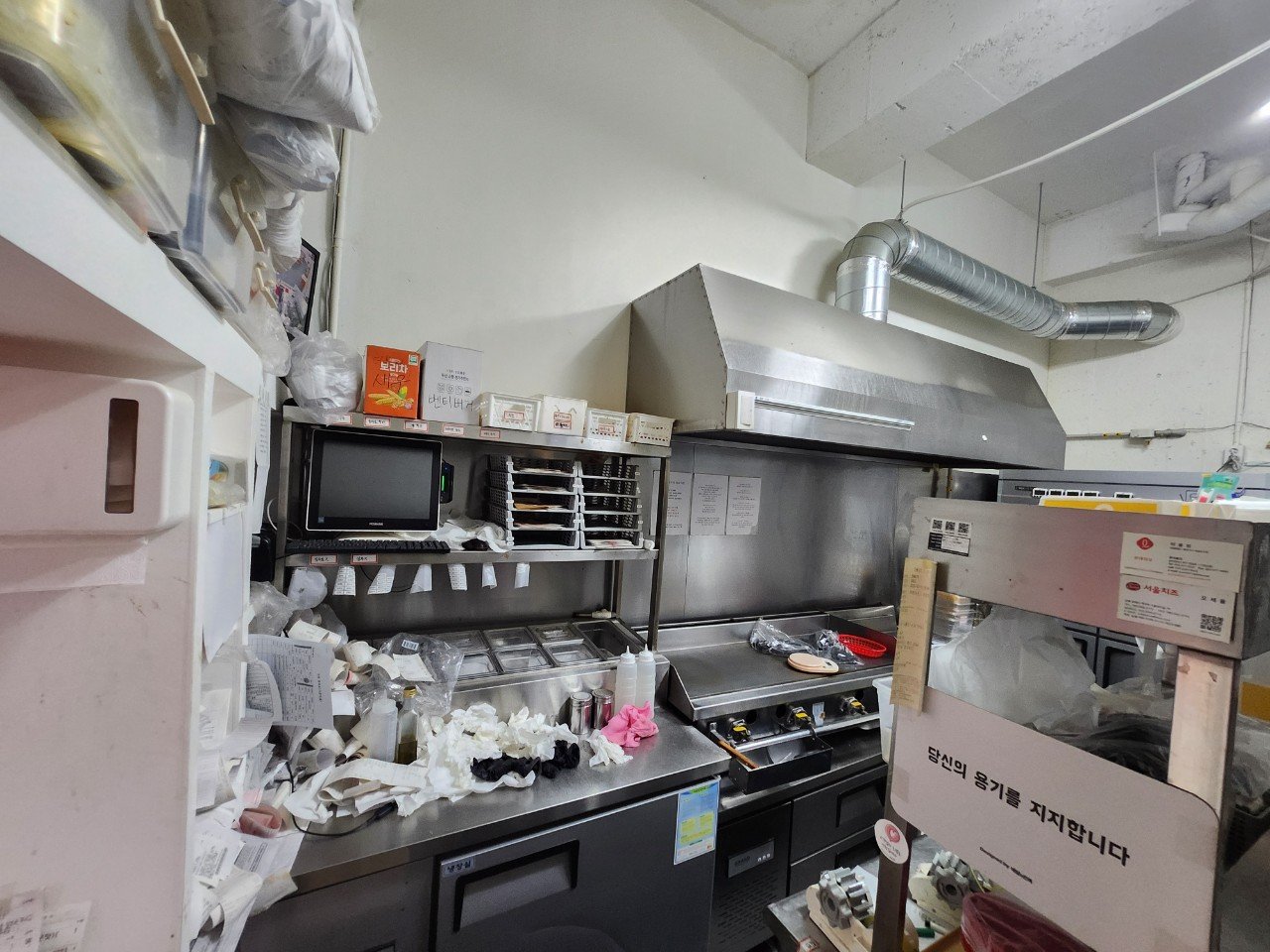 조리대와 선반 위에는 각종 식자재와 일회용품, 용기류와 박스 등이 그대로 남아 있었습니다. 이 부분은 종류별로 나누어 포장하면서, 재사용 가능한 집기와 반드시 폐기해야 할 물품을 한 번 더 구분했습니다.