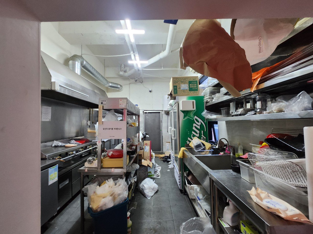 특히 매장 구조가 긴 복도형이어서 양쪽으로 주방 설비가 빼곡하게 배치되어 있었고, 단순히 짐만 빼고 나가는 정도로는 다음 임차인이나 건물 관리 측면에서 아쉬움이 남을 수밖에 없는 상황이었습니다. 깔끔하게 비워진 상태로 인도해야 한다는 임대 조건도 있어 체계적인 철거 계획이 꼭 필요했습니다.