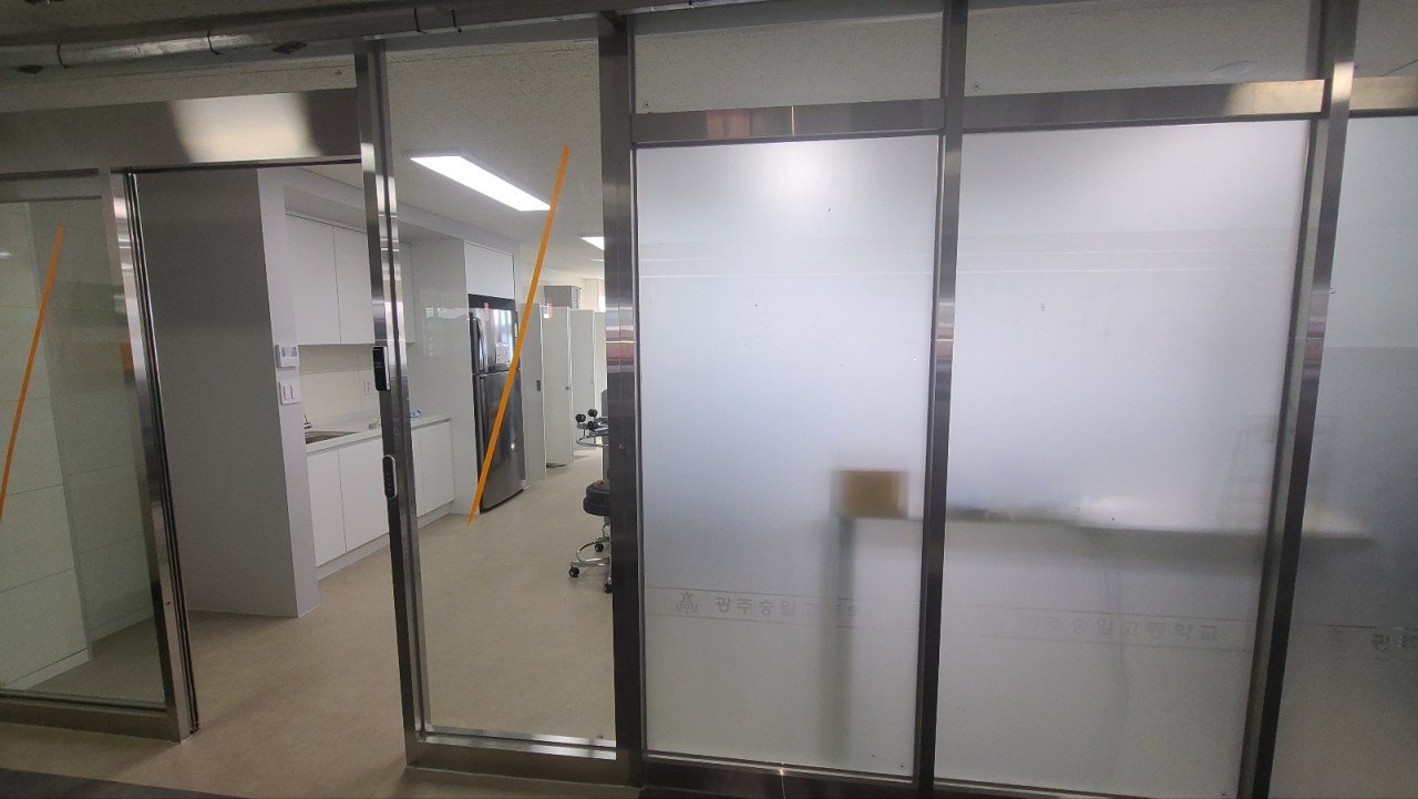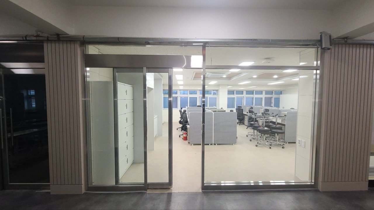 교무실과 복도 사이에는 새로 자동문을 설치했습니다. 교무실은 학생과 교직원, 방문자가 수시로 오가는 공간이기 때문에 출입이 잦고, 손에 서류나 교재를 들고 지나는 경우가 많습니다.