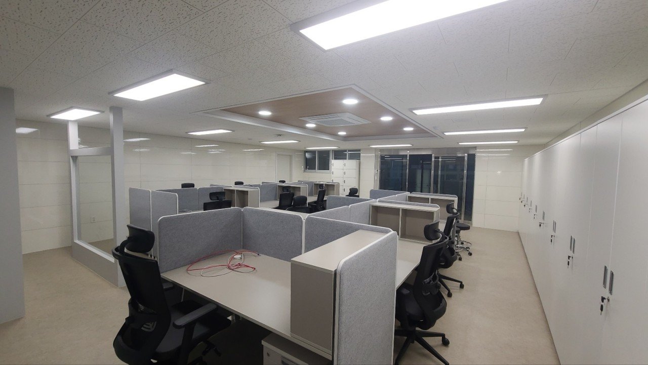 이동이 편리하도록 통로 폭을 넉넉하게 확보했고, 창가 쪽으로는 자연광이 잘 들어올 수 있도록 배치해 답답하지 않은 업무 환경을 만들었습니다. 인조조명과 자연빛이 함께 어우러져 하루 종일 머물러도 피로감이 덜한 공간이 되도록 신경 썼습니다.