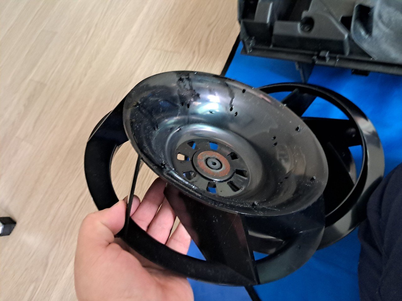 내부가 드러나자 왜 냄새와 풍량 문제가 생겼는지 바로 이유가 보였습니다.