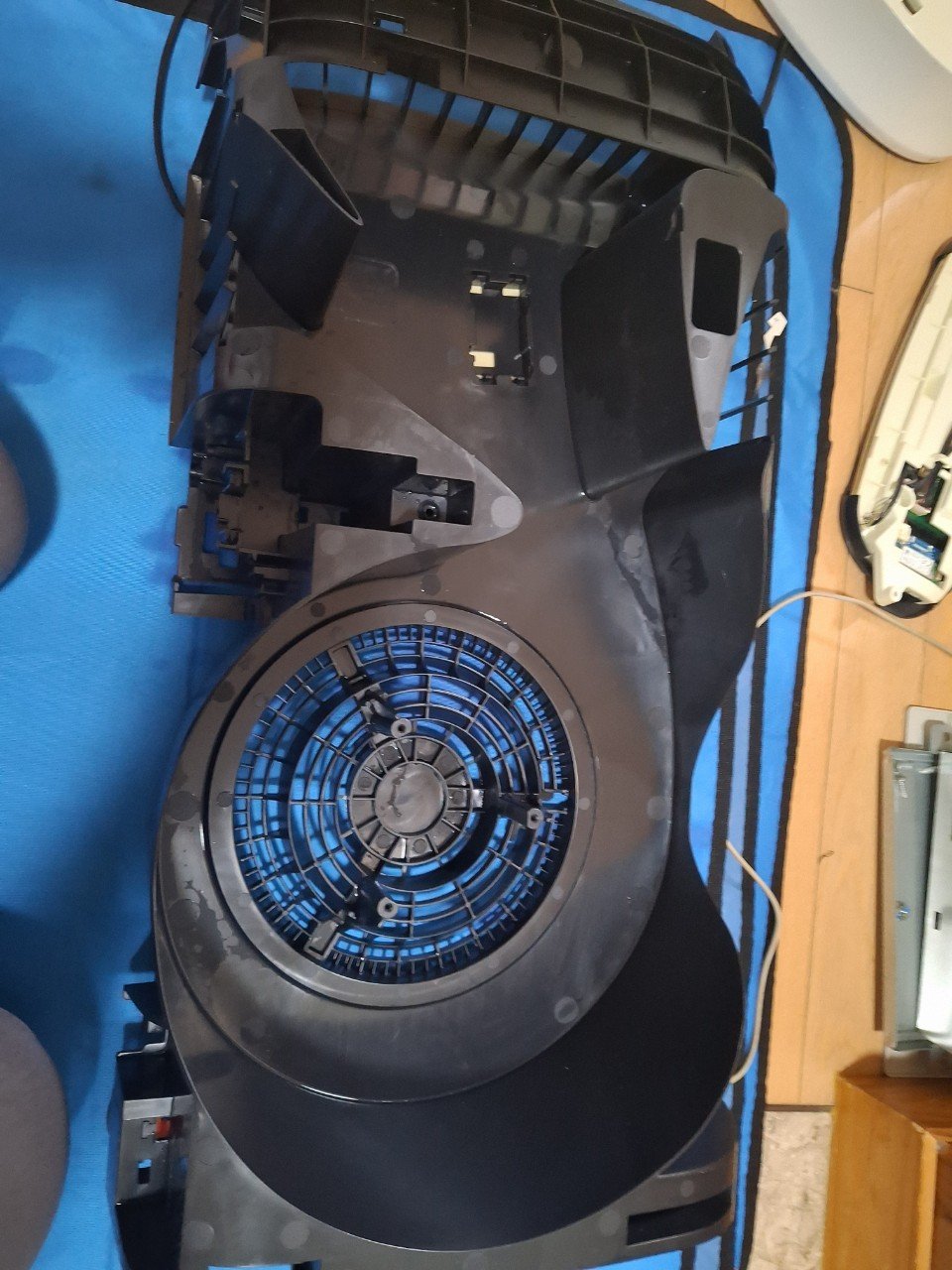 전면 흡입 그릴을 제거한 뒤 상단 토출 루버, 내부의 팬 모듈, 그리고 공기가 지나가는 흡·배기 덕트까지 차례대로 분리했습니다. 모델 구조를 정확히 알고 있어야 힘을 잘못 주어 플라스틱이 깨지거나 고정 탭이 부러지는 일을 막을 수 있습니다.