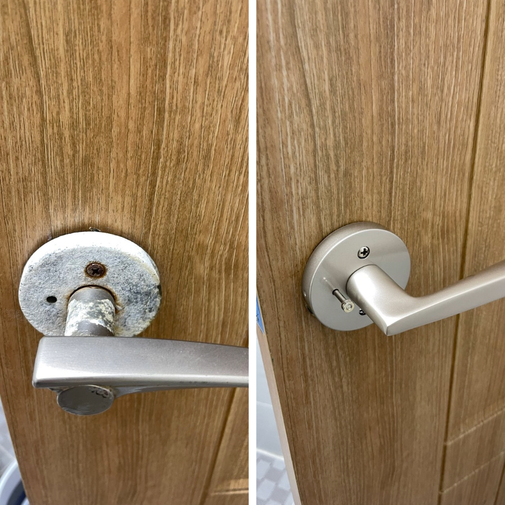 마지막으로 요청하신 화장실문 손잡이 교체도 진행했어요. 기존 손잡이는 작동이 매끄럽지 않아 분해 후 신품으로 교체, 도어 정렬과 잠금 상태까지 테스트하고 마감했습니다.