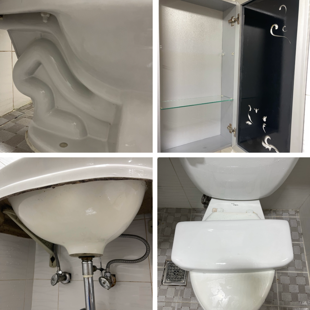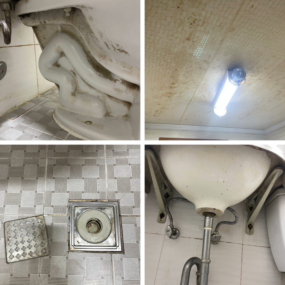 장시간 사용으로 천장이 누렇게 변색되고, 변기 하단과 세면대 아래쪽엔 굳은 오염과 니코틴 자국이 보였습니다.