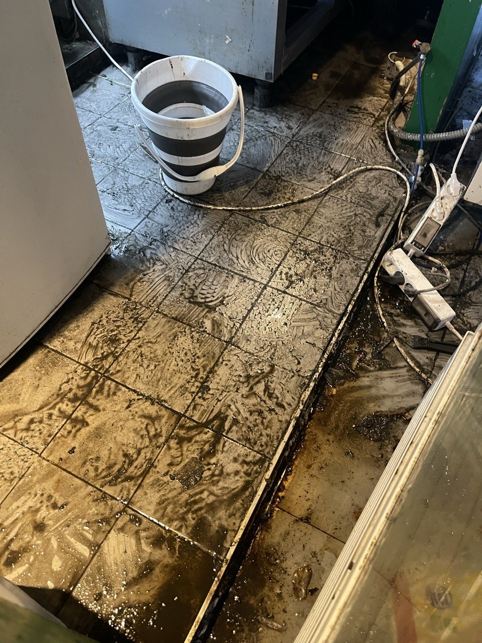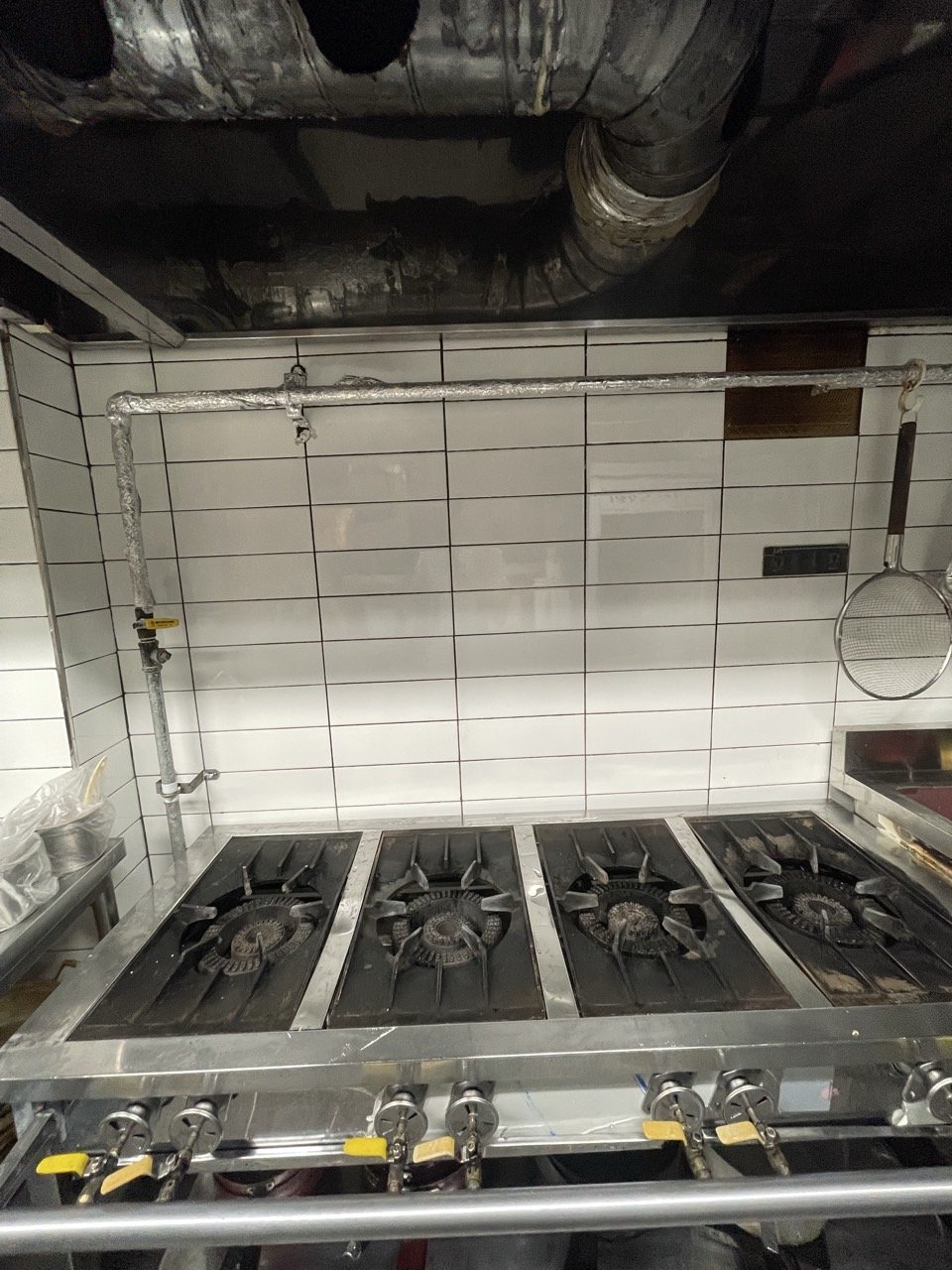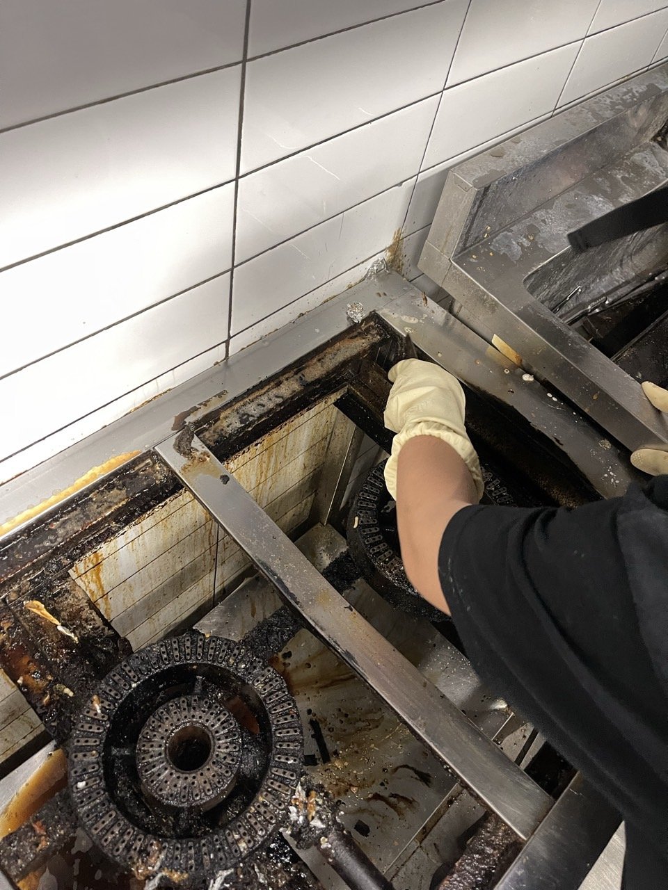 이번 현장의 포인트는 덕트와 조리 라인. 덕트 내부에는 여러 겹으로 굳은 기름이 붙어 있어 강력 약제를 도포해 불리고, 긁어내고, 다시 세척하는 과정을 반복했습니다. 약제가 흐르며 오염이 번지지 않도록 조리대와 주변 집기에는 보양 작업을 먼저 꼼꼼히 진행했어요.