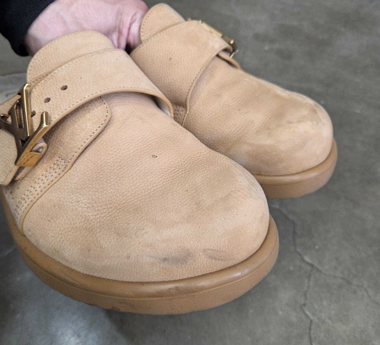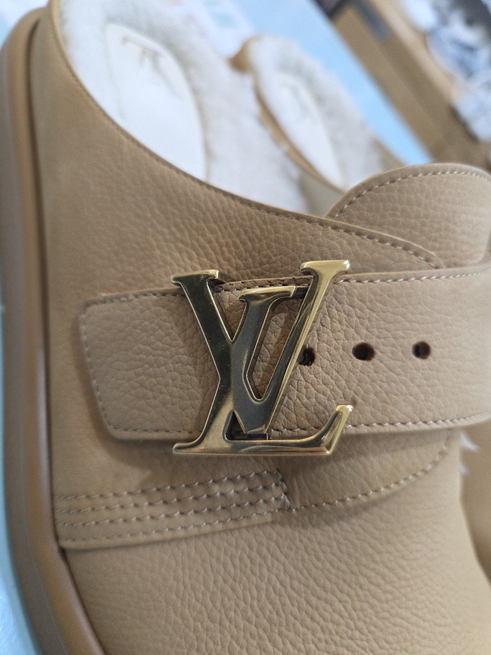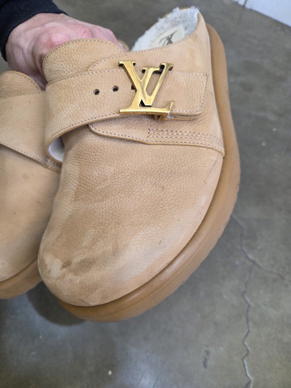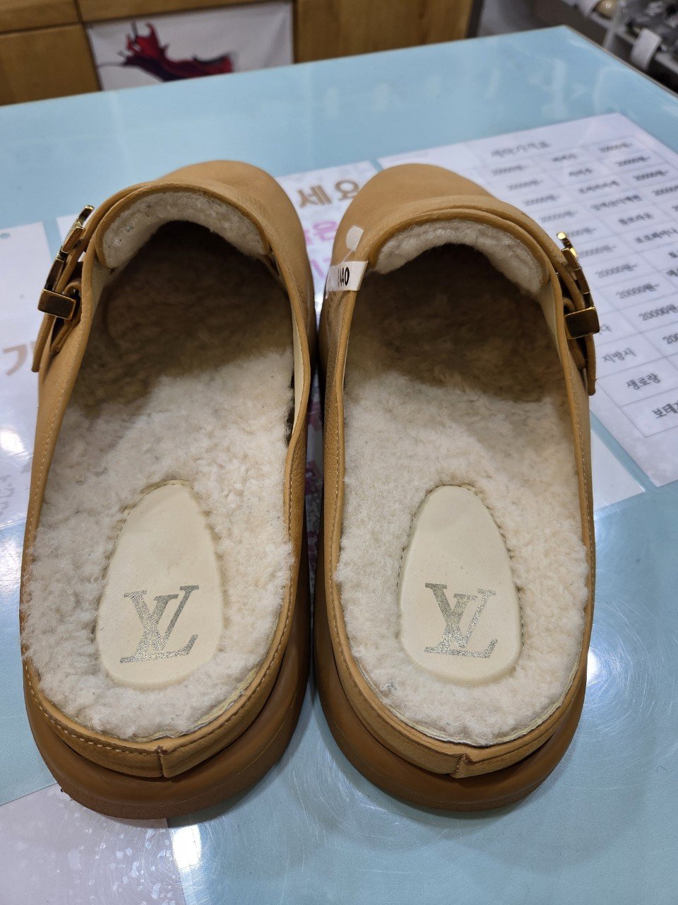 겨울 시즌을 앞두고 문의가 많아지는 아이템, 퍼 안감이 있는 가죽 슬리퍼 세탁 현장을 공유드립니다. 오늘 소개할 제품은 루이비통 남성 가죽 뮬 타입 슬리퍼로, 밝은 베이지 톤의 외피와 부드러운 양털 안감이 특징이었어요.