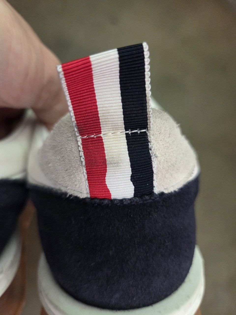이번 의뢰는 화이트와 네이비가 조합된 톰브라운 스니커즈로, 스웨이드가 포인트인 모델이었습니다. 화이트 부분에는 사용감으로 인한 얼룩이, 스웨이드에는 먼지와 묵은 때가 스며든 상태였죠.