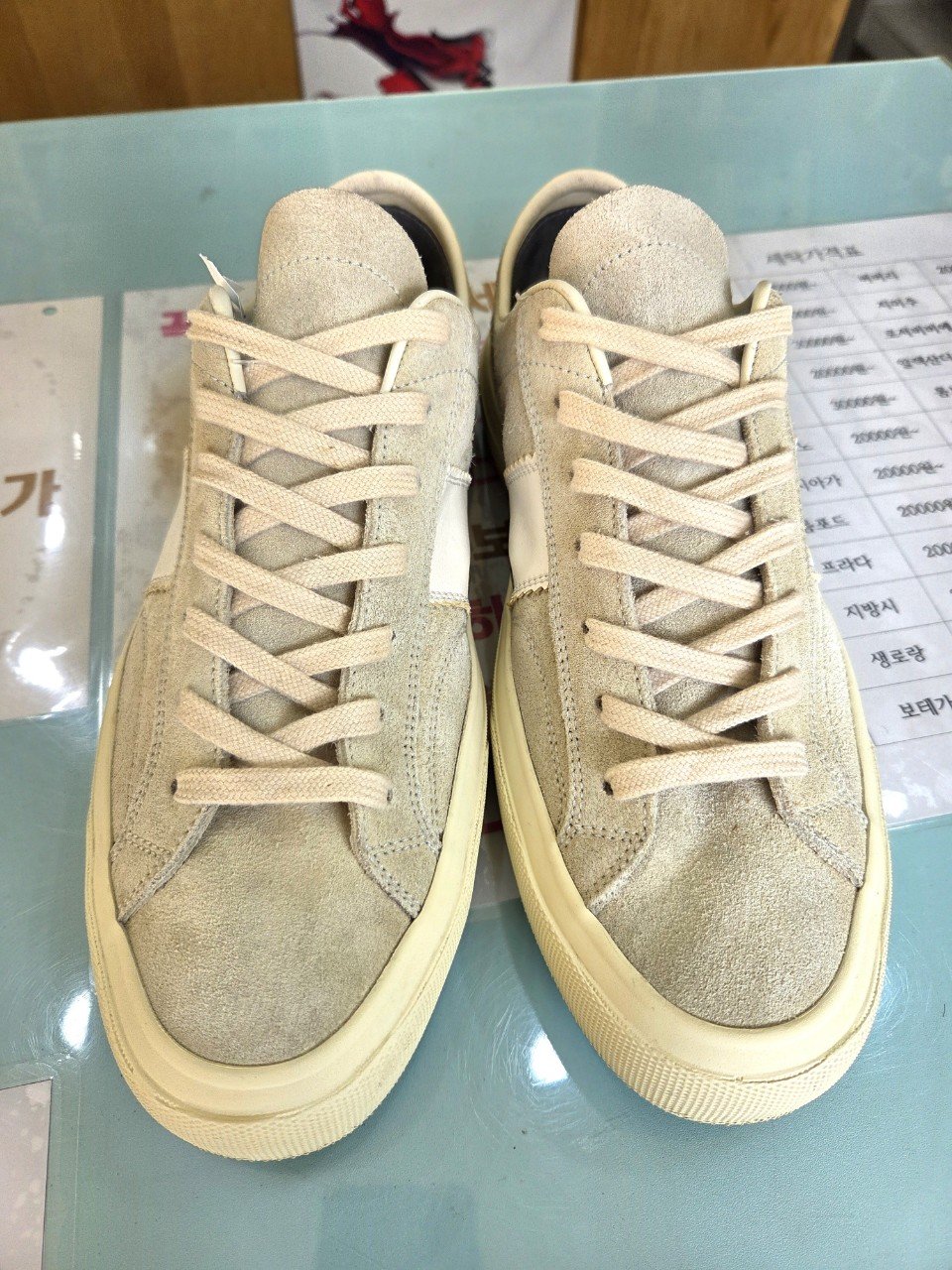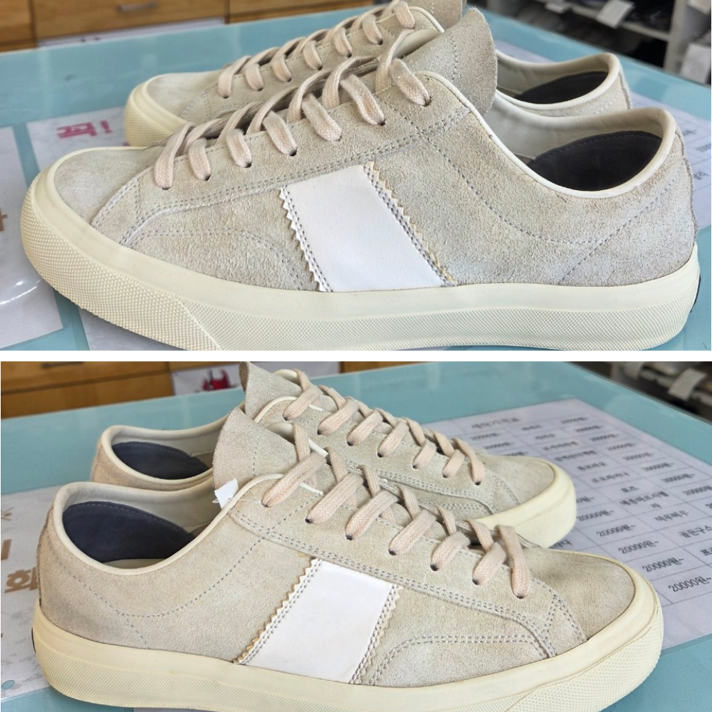 작업 후 스웨이드 특유의 부드러운 결감이 살아나고, 톤도 자연스럽게 정돈되었습니다. 바래 보이던 화이트 라인과 밑창은 깔끔하게 정리되어 전체 인상이 훨씬 산뜻해졌습니다. 의뢰 고객님께서는 “새 신발 받은 듯하다”며 크게 만족스러워하셨고, 저희도 보람을 느꼈습니다.