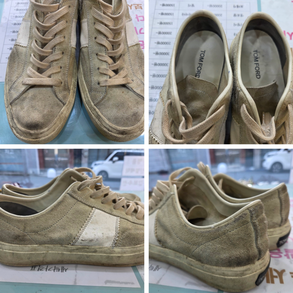이번에는 흙탕물에 빠져 심하게 오염된 톰포드 스웨이드 신발 의뢰가 들어왔습니다. 겉면엔 얼룩과 먼지가 깊게 스며 있었고, 밑창과 힐컵(뒷축)엔 때가 강하게 눌어붙어 있었죠. 특히 스웨이드 결이 완전히 죽어 외관상으로는 포기가 고민될 수준이었습니다.