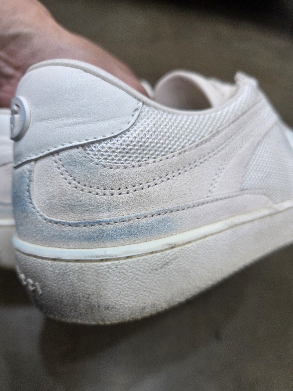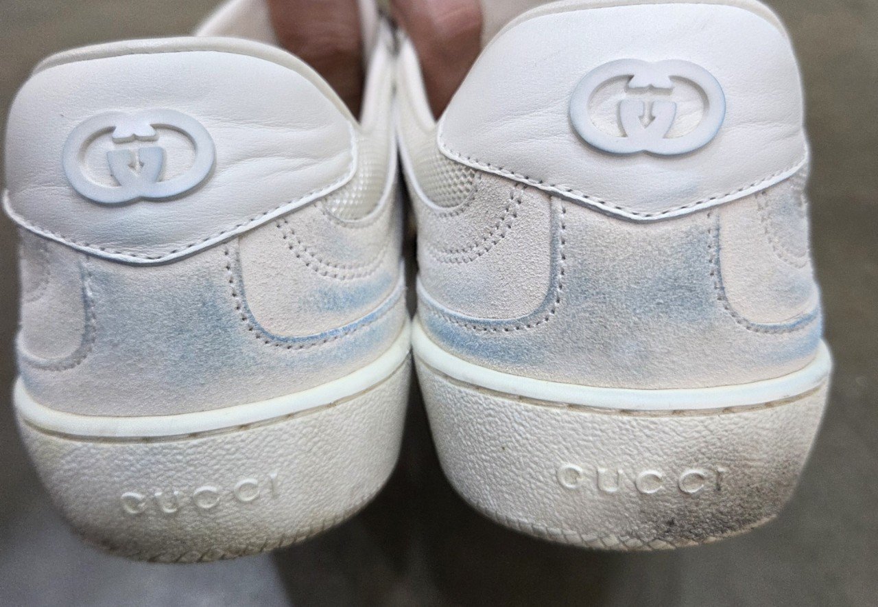 이번에 복구한 구찌 스니커즈는 청바지 밑단에 반복적으로 닿으면서 파란 이염이 스웨이드와 메쉬 깊숙이 스며든 상태였습니다. 이런 이염은 시간이 지날수록 섬유 안쪽으로 퍼지기 때문에 빠른 의뢰가 복원율을 높입니다.