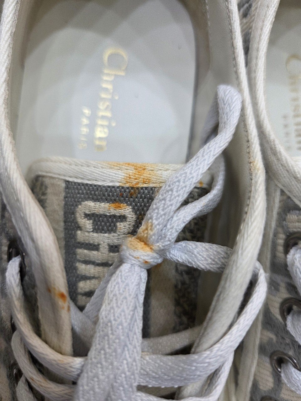 이번에는 디올 오블리크 스니커즈의 음식물 얼룩 제거 현장을 소개드립니다. 패브릭 소재 특성상 오염이 빠르게 섬유 속으로 스며드는 만큼, 방치 시간이 길수록 난도가 높아지는데요. 의뢰 신발은 옆면·끈·앞코까지 노란 얼룩이 착색된 상태로 들어왔습니다.