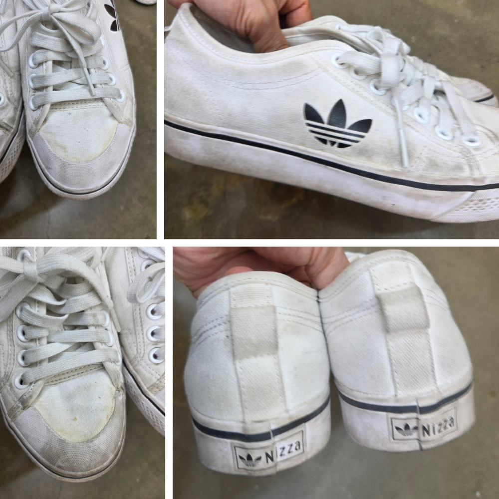 이번에는 아디다스 니짜 화이트 패브릭 운동화 의뢰가 들어왔습니다. “자주 신다 보니 전체적으로 누렇게 변하고, 앞코 얼룩이 심하다”는 상담이었는데요. 패브릭은 물기와 오염을 빨아들이는 성질이 강해 방치하면 변색과 착색이 쉽게 고착되죠.