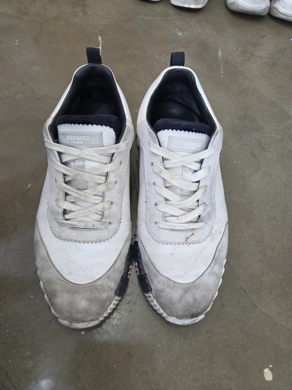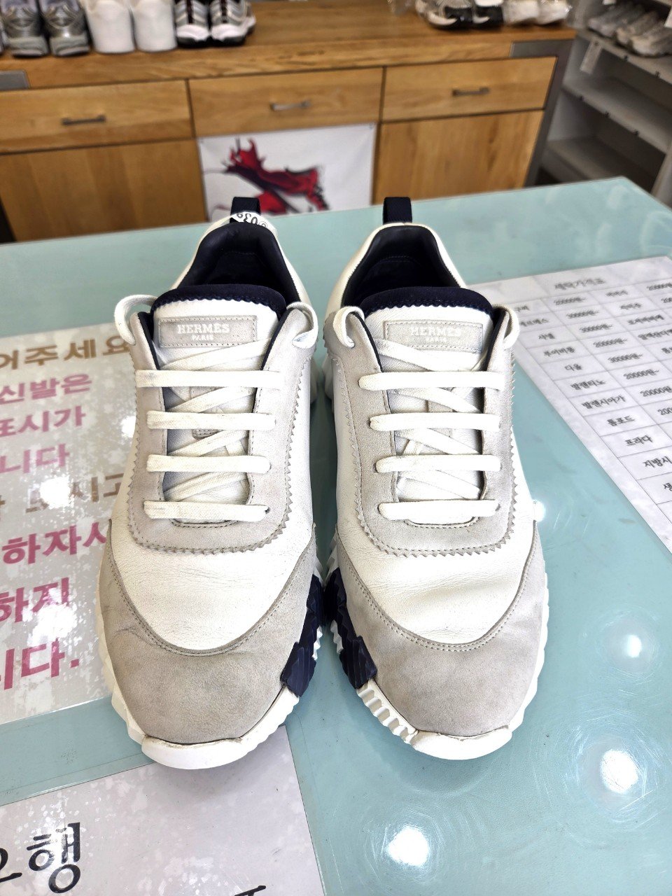 오늘은 택배로 접수된 에르메스 바운싱 스니커즈 세탁 현장 후기를 소개해요. 겉보기에도 앞코 스웨이드 오염이 꽤 깊었고, 젖은 상태에서 묻은 얼룩이라 조직 안쪽까지 스며든 상황이었어요. 여기에 내피가 진한 검정이라 자칫하면 이염이 올라올 수 있어, 정말 조심스러운 작업이 필요했습니다.