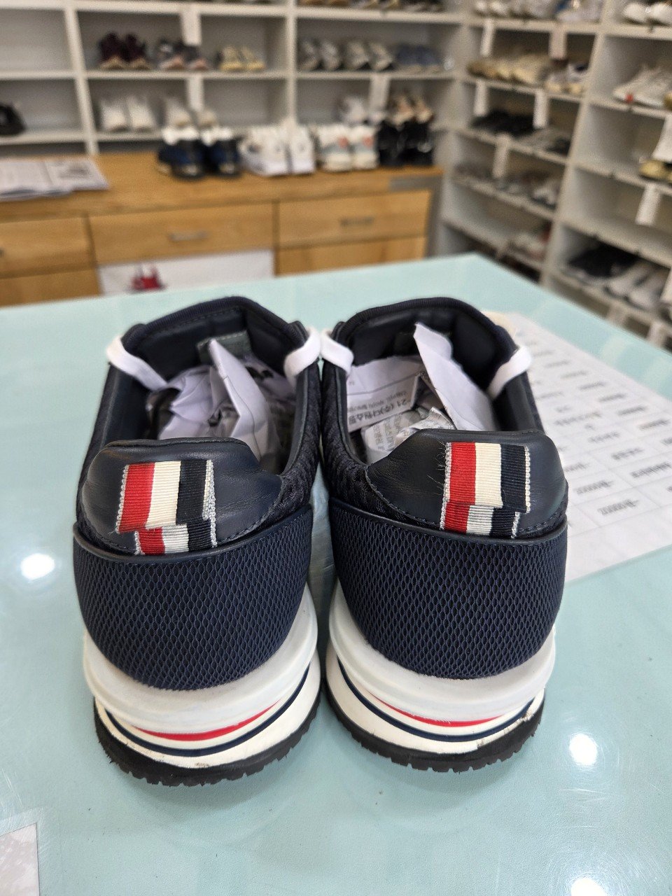 의뢰品은 흰색 베이스의 톰브라운 스니커즈로, 측면 이니셜과 뒷면 시그니처 스트랩 부위에서 파란색 이염이 확인됐어요. 이미 젖은 상태에서 마찰이 있었던지 색소가 깊게 침착된 상황이었고, 생활 오염도 함께 누적돼 있었습니다.