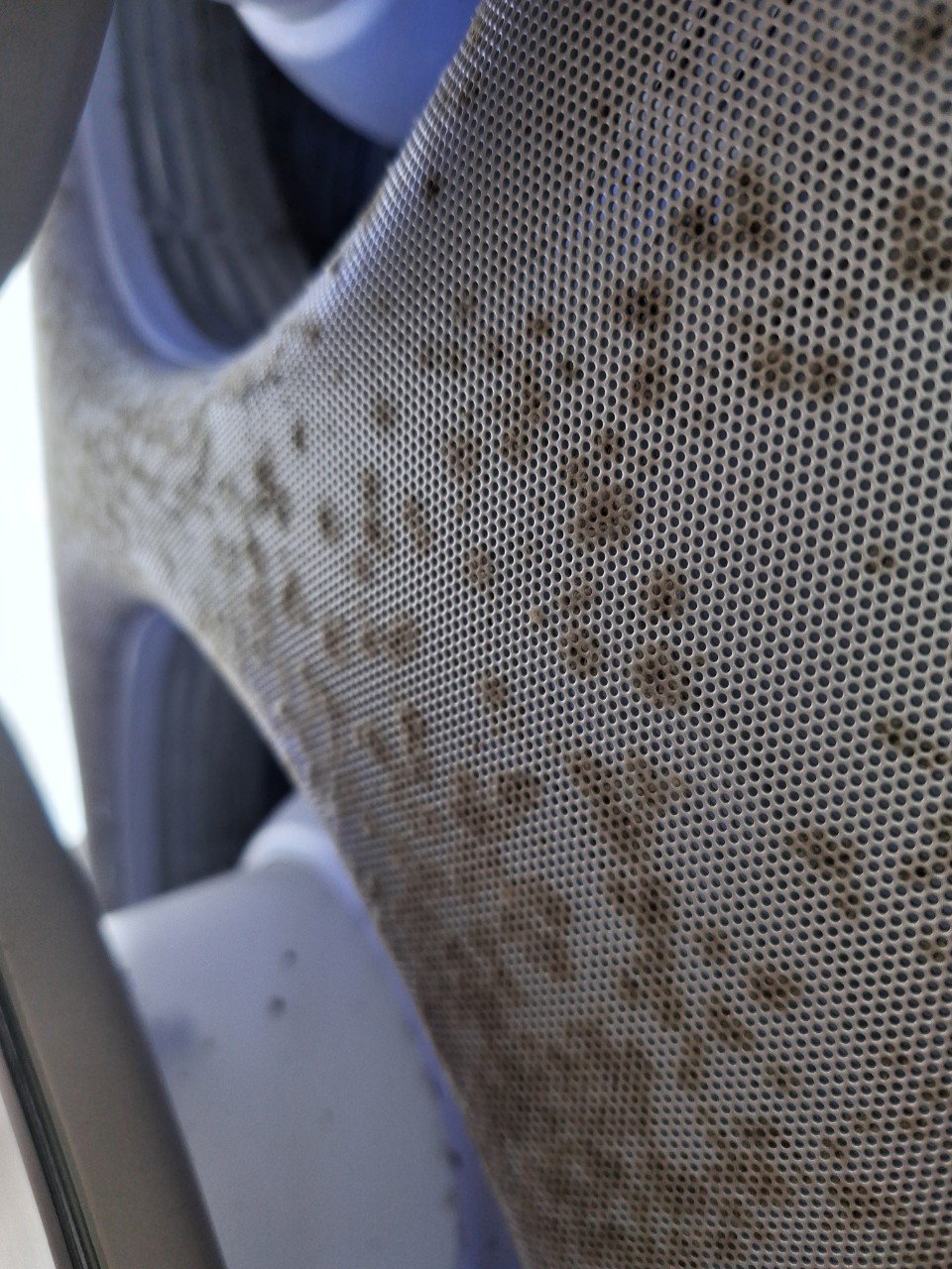 문제는 그 뒤쪽, 토출부와 냉각핀 주변이었습니다. 안쪽으로 깊이 들어갈수록 곰팡이 오염이 더 진하게 자리 잡고 있었고, 특히 원형 토출부 주변 그릴 틈사이에 검은 점들이 촘촘하게 박혀 있는 모습이 확인되었습니다.