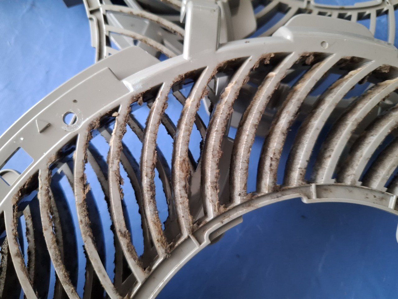 외장 패널을 열고 안쪽을 들여다보니, 가장 먼저 눈에 들어온 것은 흡입부 필터 주변의 먼지와 생활 오염이었습니다. 이 정도의 먼지는 대부분의 가정에서 흔하게 볼 수 있는 수준입니다.