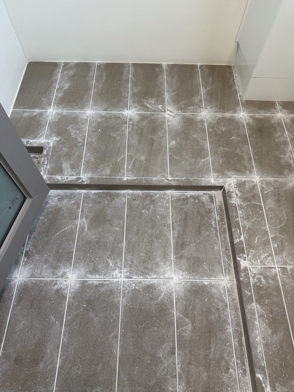 신축 아파트라고 해서 마감이 모두 완벽한 것은 아닙니다. 이번 현장 역시 시공 전 상태를 확인해보니 타일 사이사이에 남아 있는 분진과 백시멘트 가루, 모서리 주변 잔여물들이 눈에 띄었습니다.
