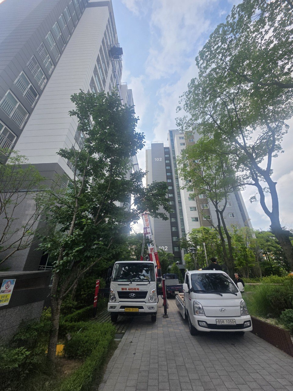 고층 아파트 특성상 안전이 최우선이었습니다. 바닥 상태를 먼저 확인해 지지 안정성을 확보하고, 아웃트리거를 충분히 펼쳐 장비를 단단히 고정했습니다. 이후 작업 각도를 세밀히 조정하고, 하중을 계산해 흔들림이 없도록 반복 점검했어요. 필요 구간은 작업 동선을 통제해 주민과 보행자 안전도 챙겼습니다.
