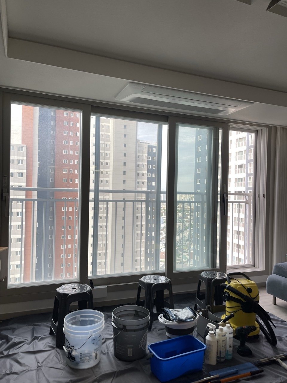 이번에는 대구 수성구 범어동 범어에일린의뜰 아파트 외창청소 현장후기를 공유합니다. 거주 중인 집이라 바닥이나 가구가 오염되지 않도록 보양 시트를 먼저 꼼꼼히 깔고 시작했어요.