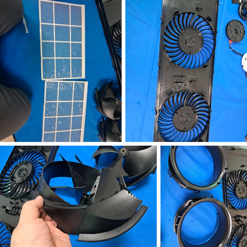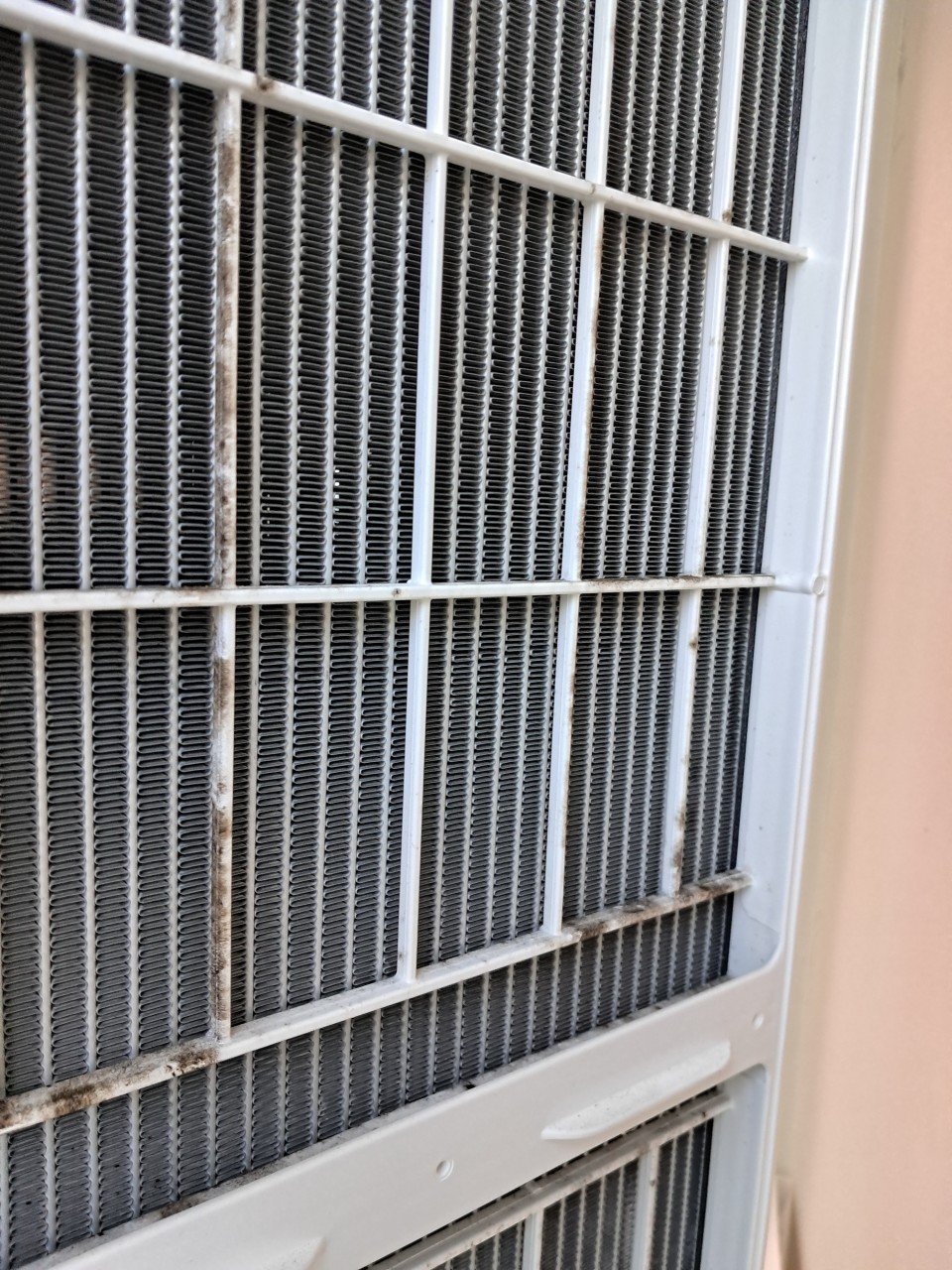 이 정도 상태에서는 단순히 필터만 털어내거나 물로 헹구는 정도로는 부족합니다. 내부 구조물을 분해한 뒤 냉각핀과 바람이 지나가는 통로까지 꼼꼼하게 세척해야 체감되는 냄새와 바람의 질이 확실하게 달라집니다.