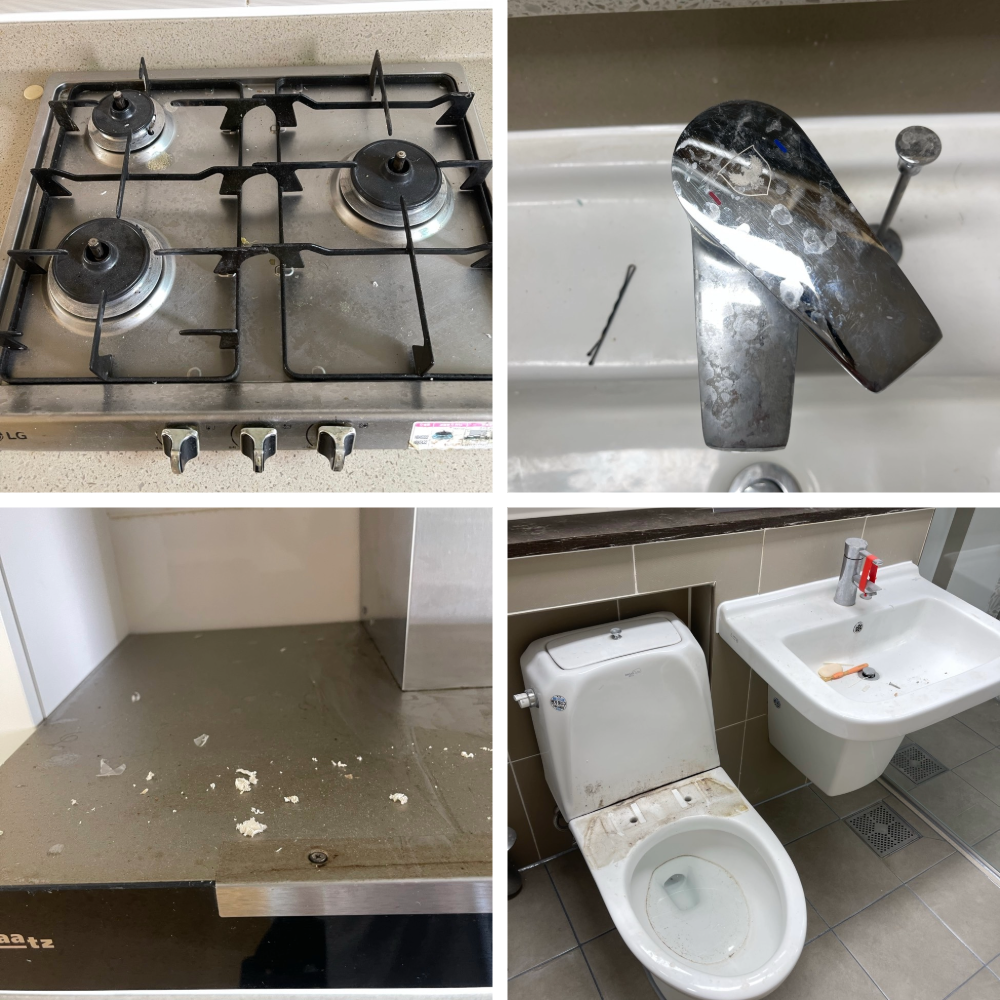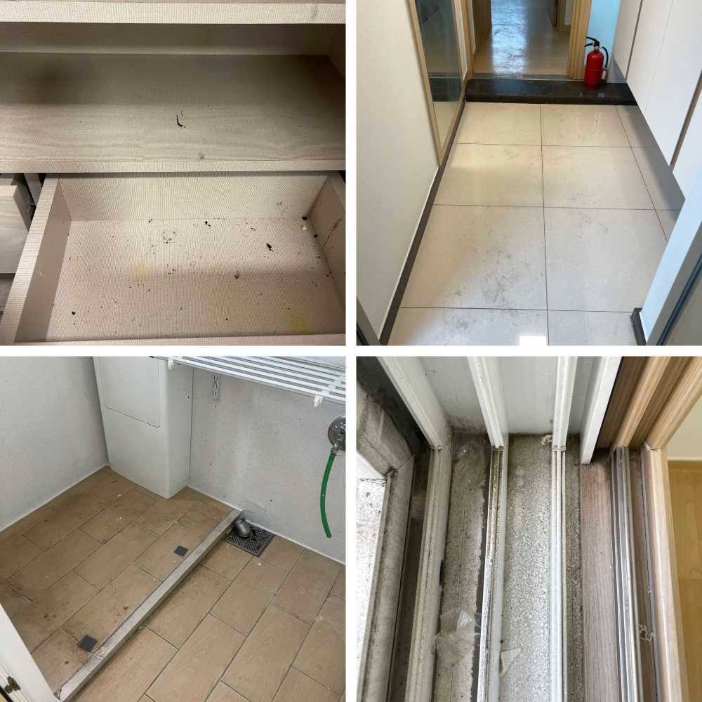 현관에서 거실로 이어지는 바닥에는 발자국과 생활 얼룩이 다수 확인되었습니다. 주방 상부에는 기름때가, 가스레인지와 후드 주변에는 음식물 잔여물이 두껍게 쌓여 있었고, 수납장 내부와 서랍에도 먼지가 많이 쌓여 고객님도 처음 보시고 놀라워하셨어요.