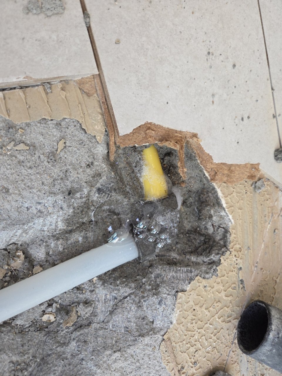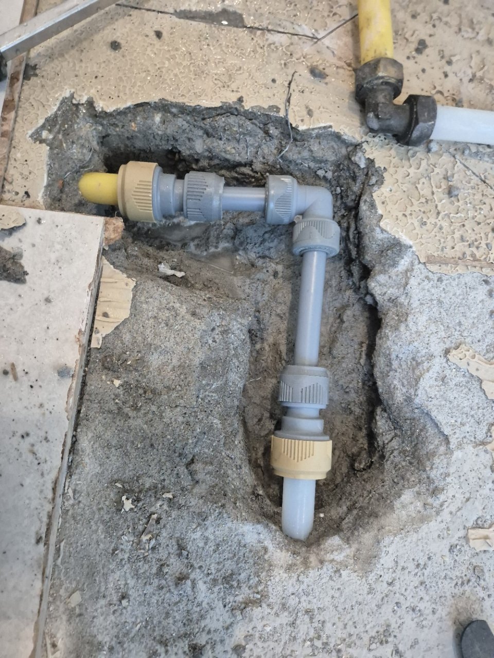 탐지 결과 문제 구간은 베란다 확장 과정에서 연장된 난방배관 연결부로 확인됐습니다. 실제로 바닥을 열어보니 기존 PPC 배관에 규격이 맞지 않는 XL 배관 소켓이 사용된 상태였고, 바로 그 연결부에서 누수가 발생하고 있었습니다.