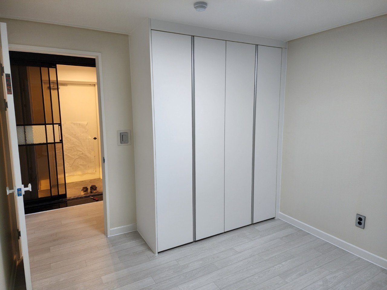각 방에는 붙박이장을 배치해 수납 스트레스를 덜었습니다. 내구성 좋은 도어 마감과 심플한 손잡이 라인으로 통일감을 주고, 바닥재는 생활 스크래치와 오염에 강한 제품으로 선택했어요. 임대 조건에서 가장 민감한 부분이 수납과 마감 내구성인데, 두 가지를 동시에 잡았습니다.