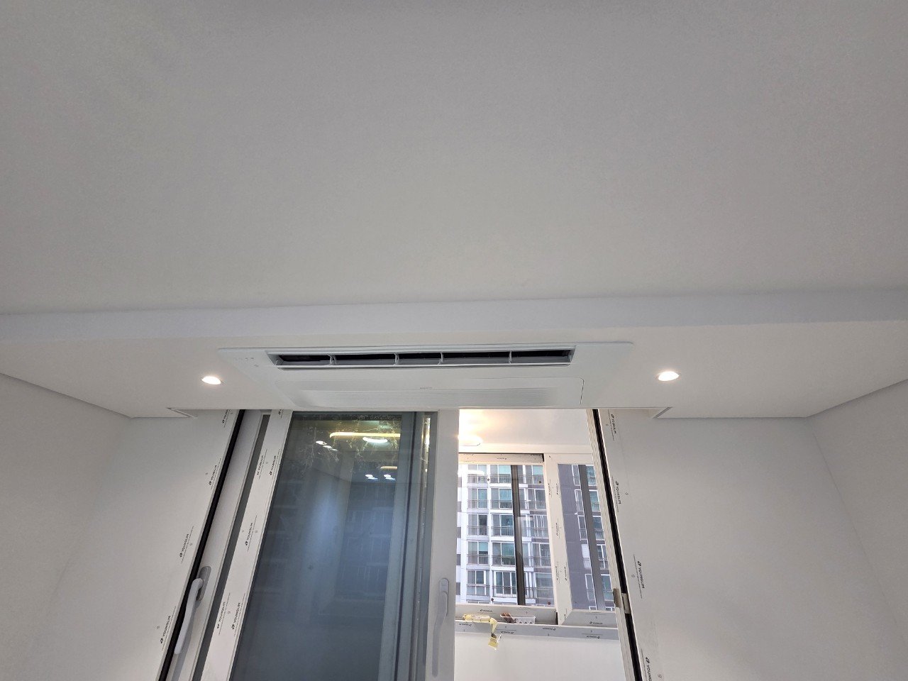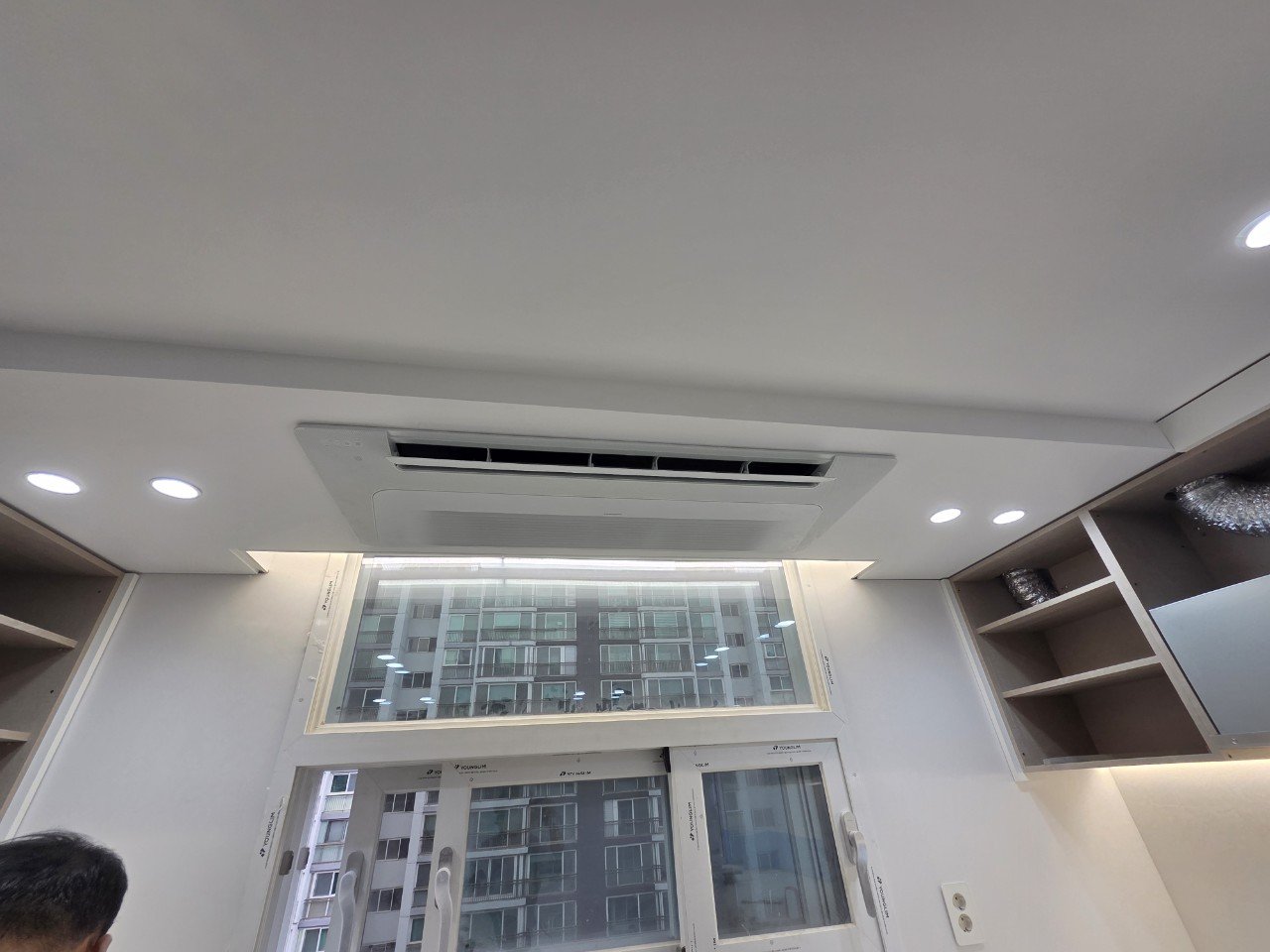 특히 거실과 주방은 하나의 큰 공간처럼 이어지는 구조였기 때문에, 천장 속 보상고를 활용해 배관을 빼고, 송풍 방향을 조정해 거실과 주방 전체에 바람이 고르게 전달되도록 했습니다.