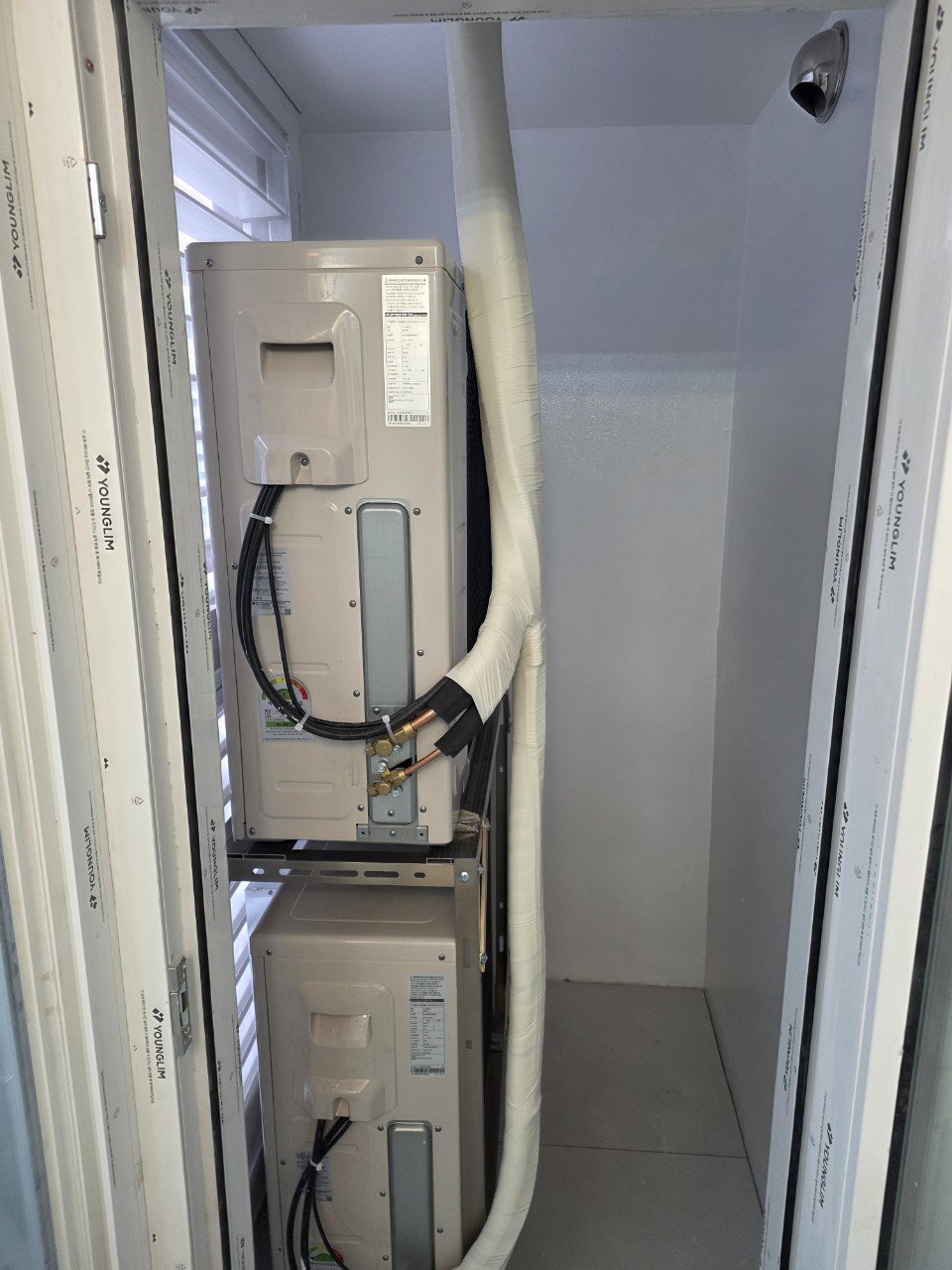 이 현장의 실외기실은 공간이 넉넉하지 않은 구조였습니다. 그래서 실외기를 2단 브라켓을 사용해 적층 방식으로 배치했습니다.