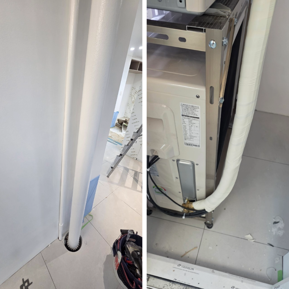 또 한 가지 중요하게 본 부분은 마감 뒤의 모습입니다. 벽을 타고 내려와야 하는 구간은 이후 도배와 목공 마감이 자연스럽게 이어질 수 있도록 최대한 벽체 안으로 숨겨서 배관을 정리했습니다. 완공 후에 에어컨 배관이 눈에 띄지 않도록 하는 것이 목표였습니다.