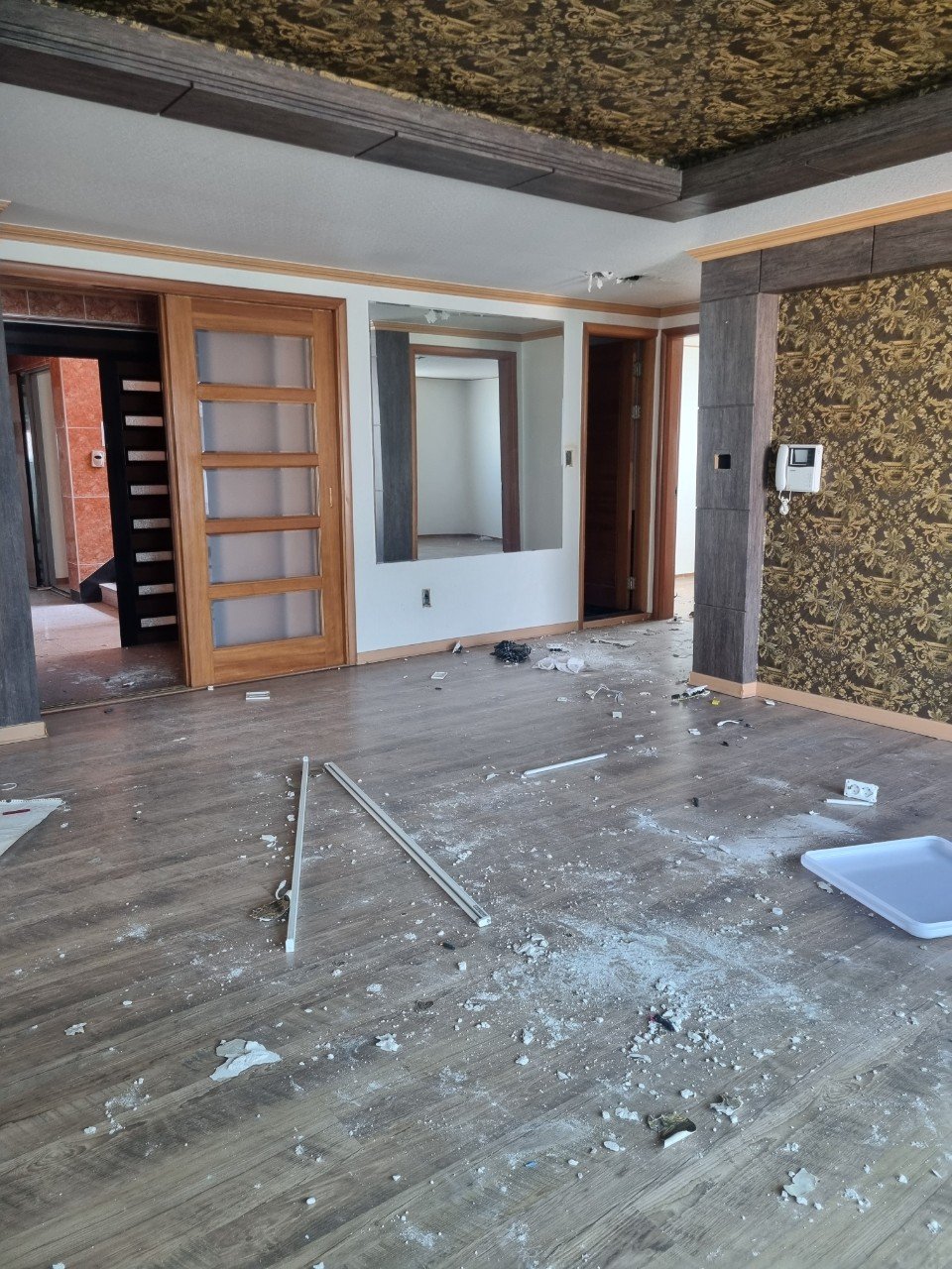오늘 진행한 범위는 주방 싱크대와 붙박이 가구, 세대 내부 경량벽과 일부 비내력벽, 천장 마감재, 노후 몰딩과 배선 트레이까지 단계적으로 제거하는 일이었습니다. 바닥은 상태에 따라 보존 또는 철거를 결정하는데, 들뜸과 수분 흔적이 확인된 구간은 과감히 걷어냈습니다.