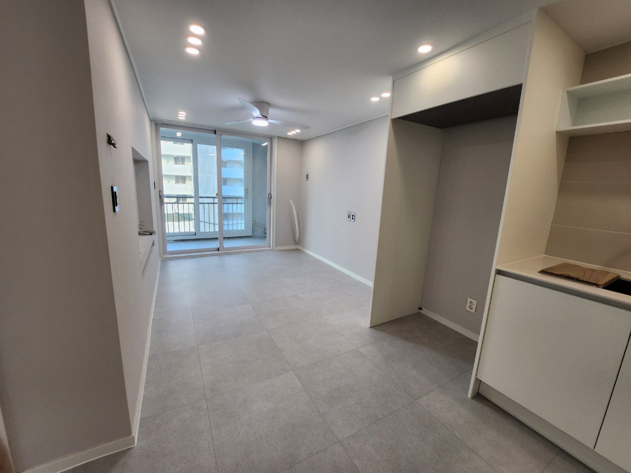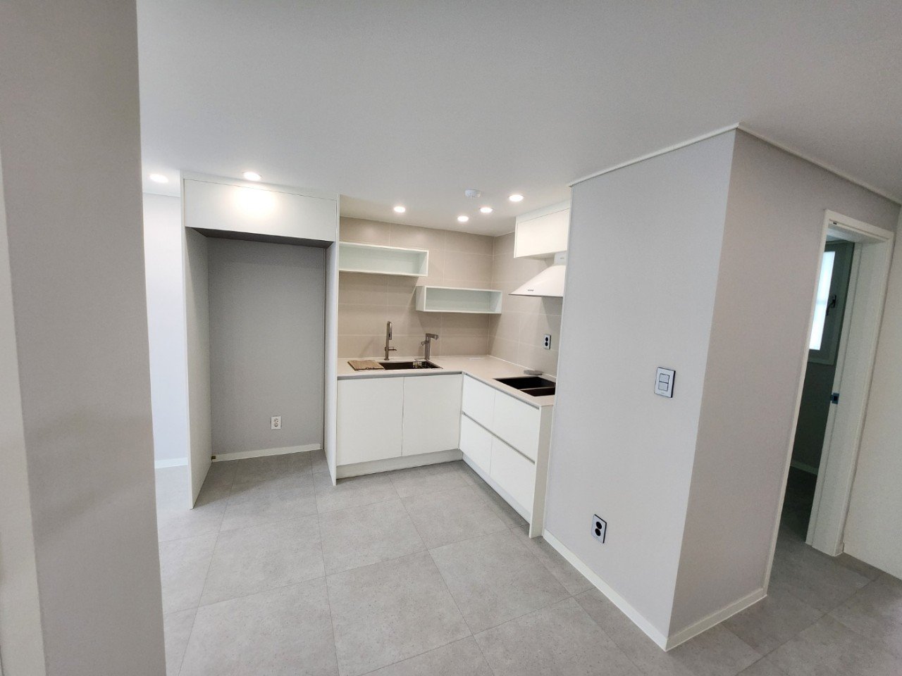 소형 평형에서 가장 중요한 건 ‘시선의 흐름’과 ‘연결감’이죠. 바닥은 600x600 대형 타일을 방–거실–주방까지 경계 없이 이어 시공했습니다. 현장에서 체감해보니 문을 여는 순간 시선이 쭉 뻗어나가며 공간이 확 열리는 느낌이 확실했어요.