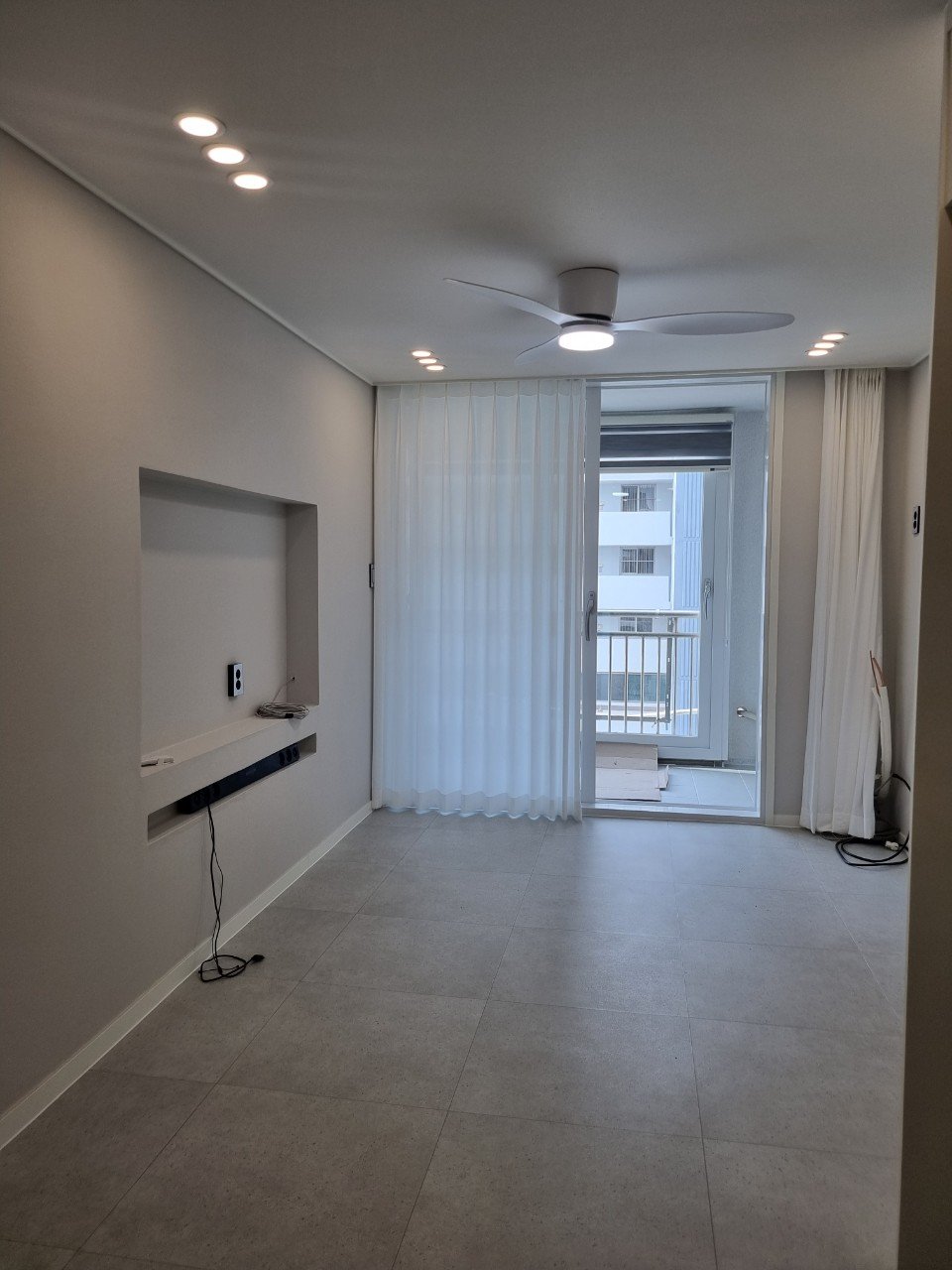 거실 벽면은 벽걸이 TV와 사운드바를 고려한 음각 디자인으로 마감했습니다. 모뎀과 인터넷 선까지 정리되는 구조라 설치 이후에도 전선 노출 없이 깔끔함을 유지할 수 있어요.