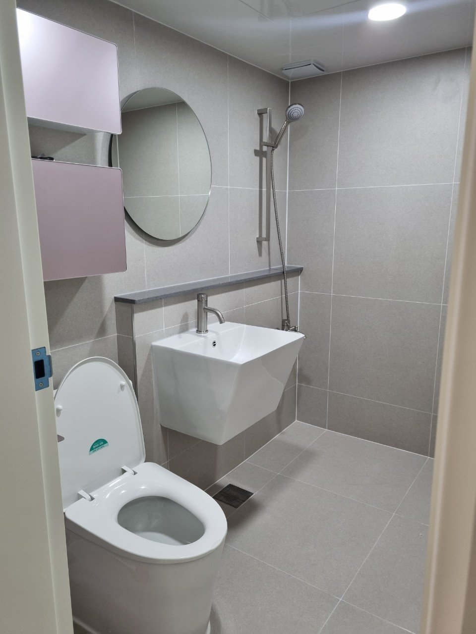욕실은 대형 타일로 통일감을 주고, 톤다운된 핑크 컬러 수납장으로 포인트를 더했습니다. 줄눈이 적어 보이는 덕분에 시각적으로도 깔끔하고, 포근한 분위기가 어우러져 작은 욕실에서도 고급스러움이 느껴졌어요.
